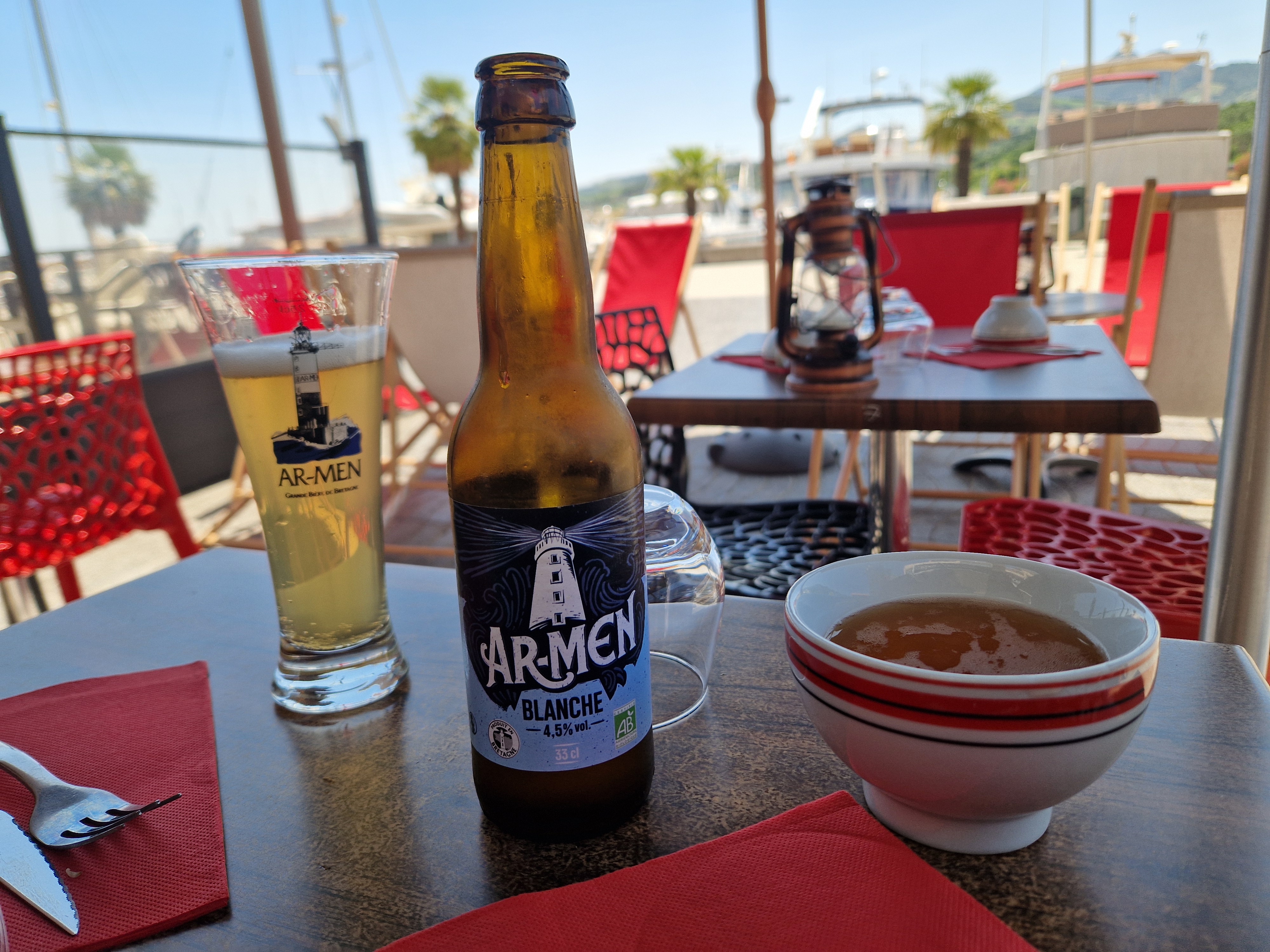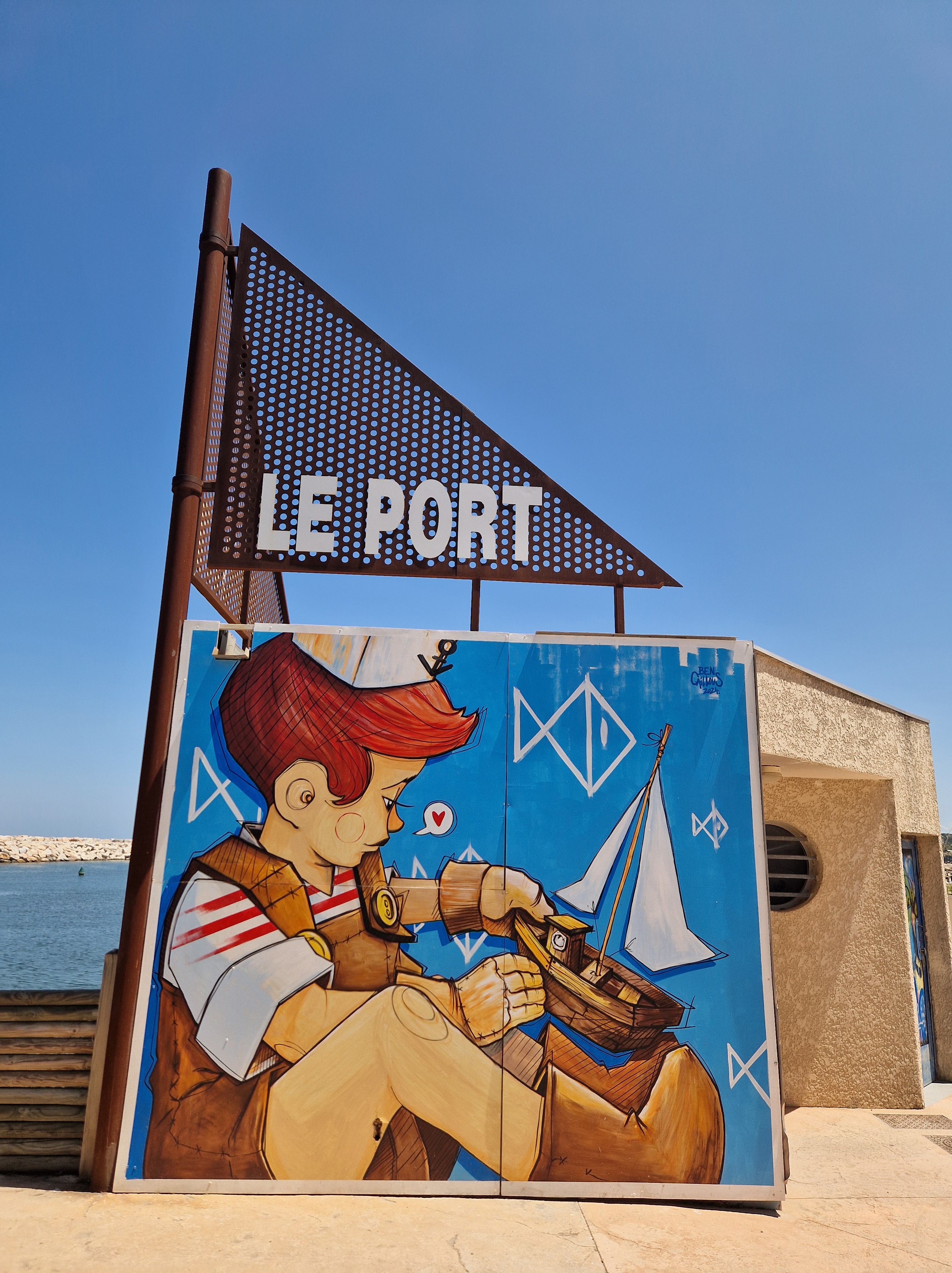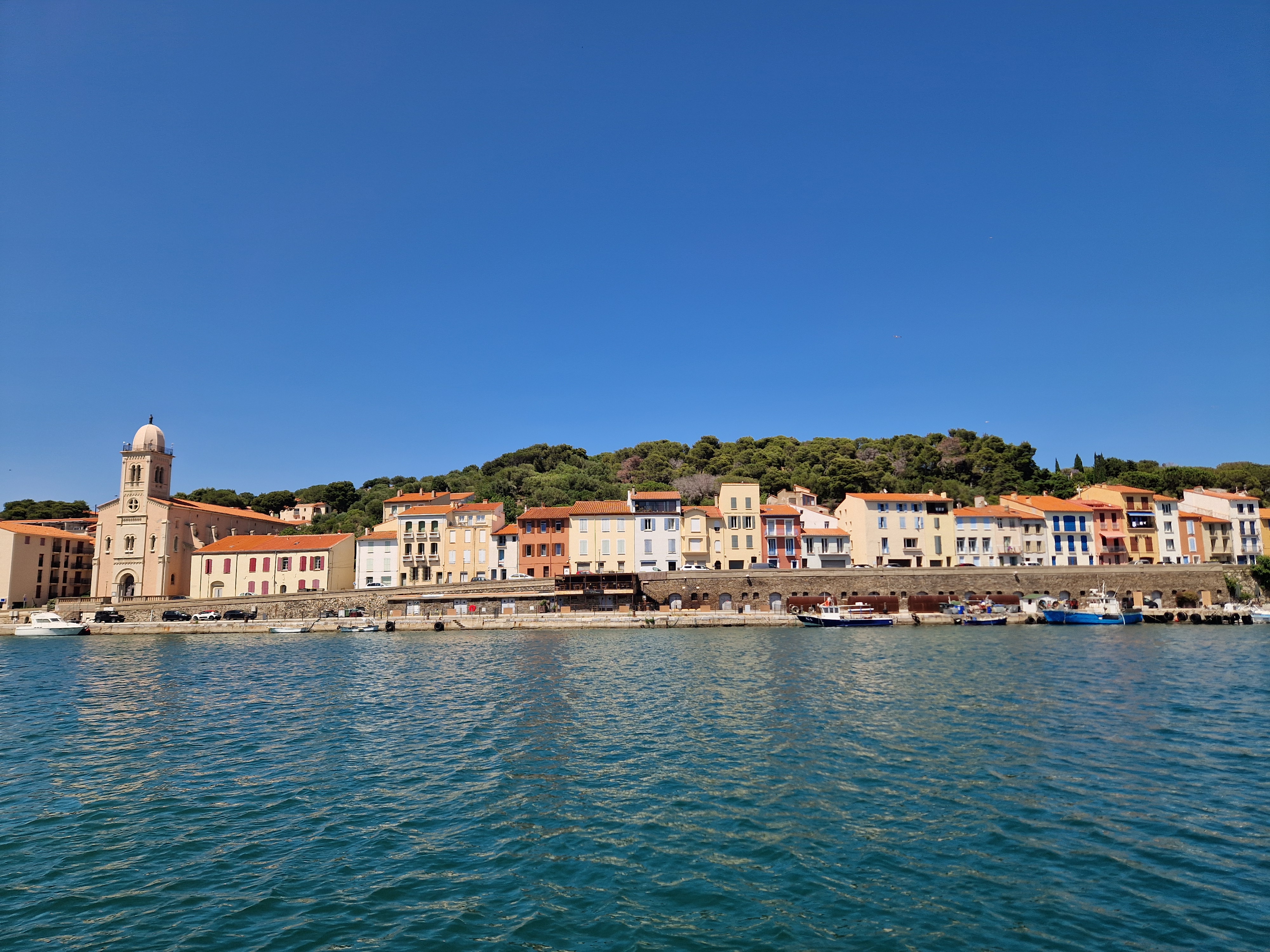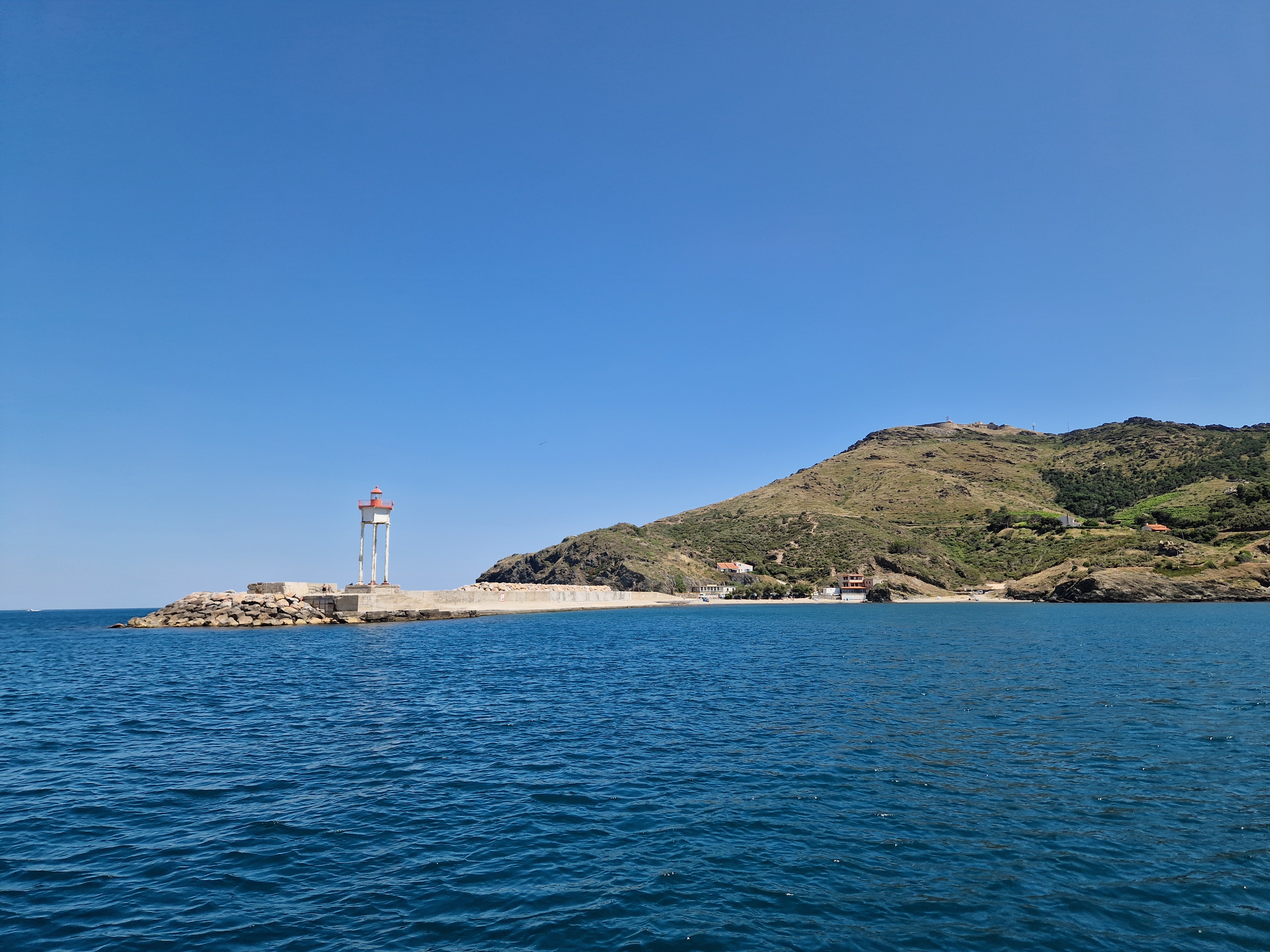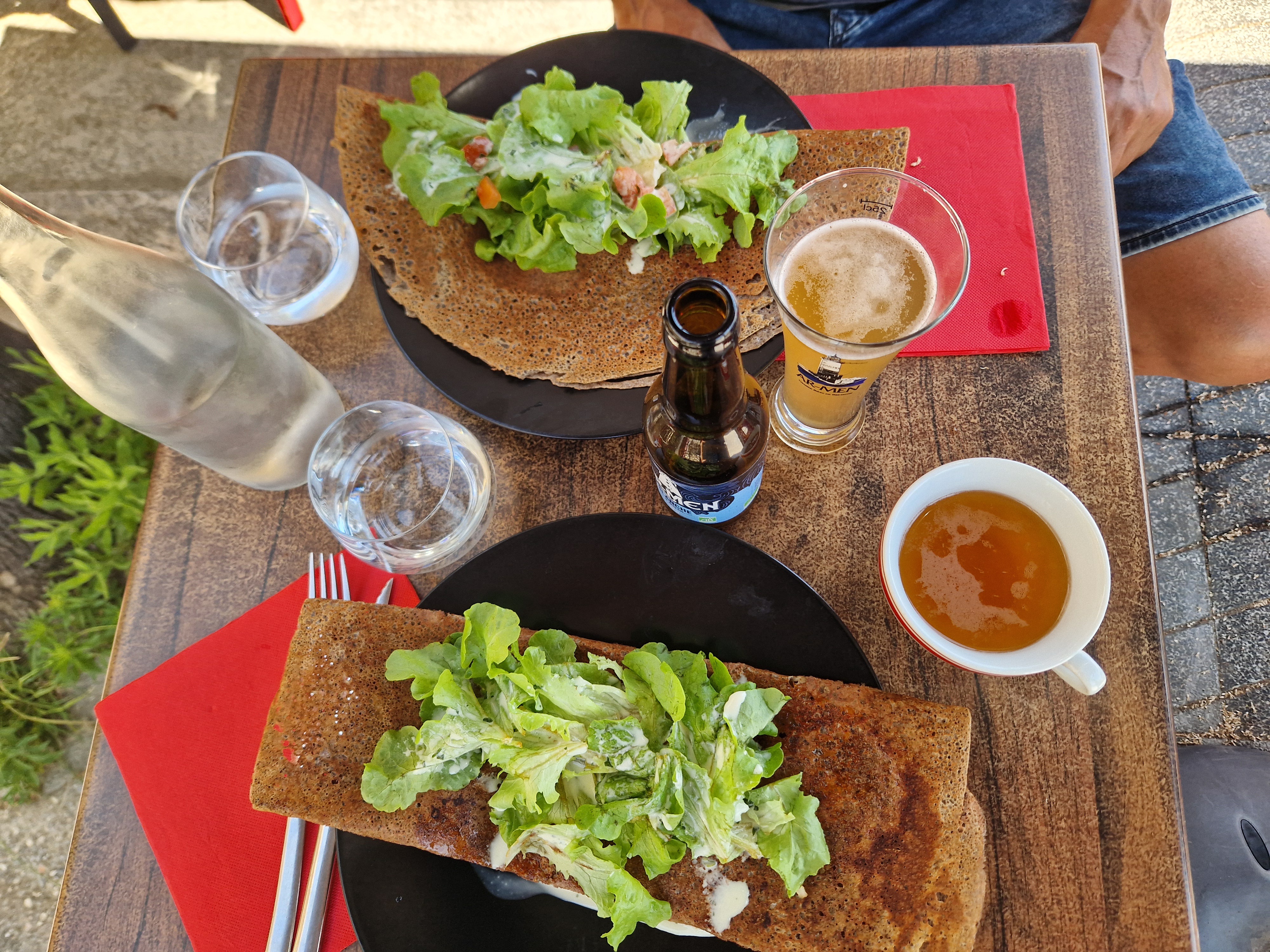 Om eens niet met de auto erop uit te gaan, plannen we een rondvaartje vanuit Argelès-sur-Mer. De zon brandt gaten in het marmeren wegdek van de boulevard. We kopen bij de stalletjes langs de boulevard vast kaartjes voor de boot, ja, de hond mag ook mee. Nu hebben tijd over. “Als we nu eens gingen lunchen met pannenkoeken?” Crèpes en cidre brut, dat is toch vakantie?