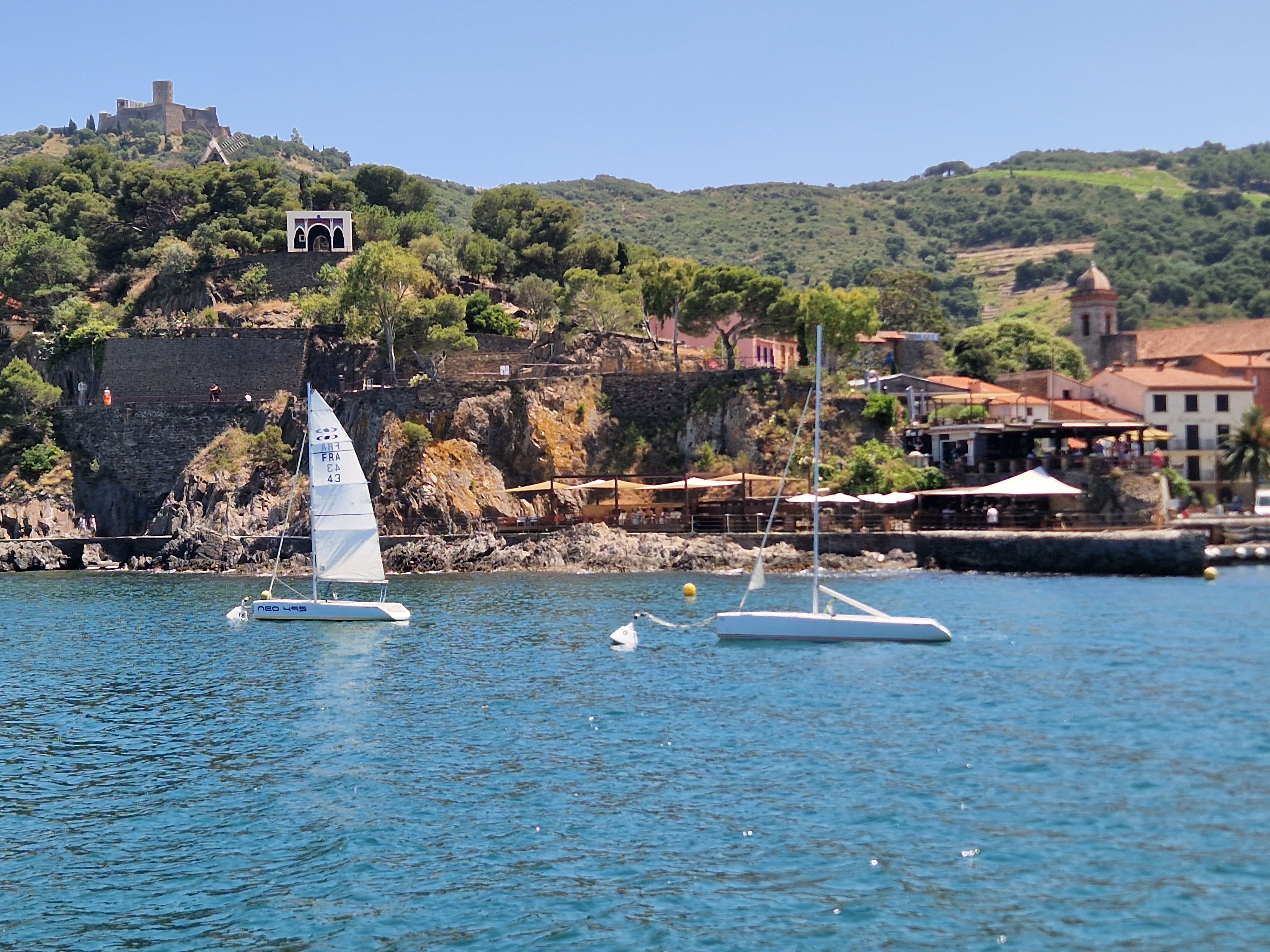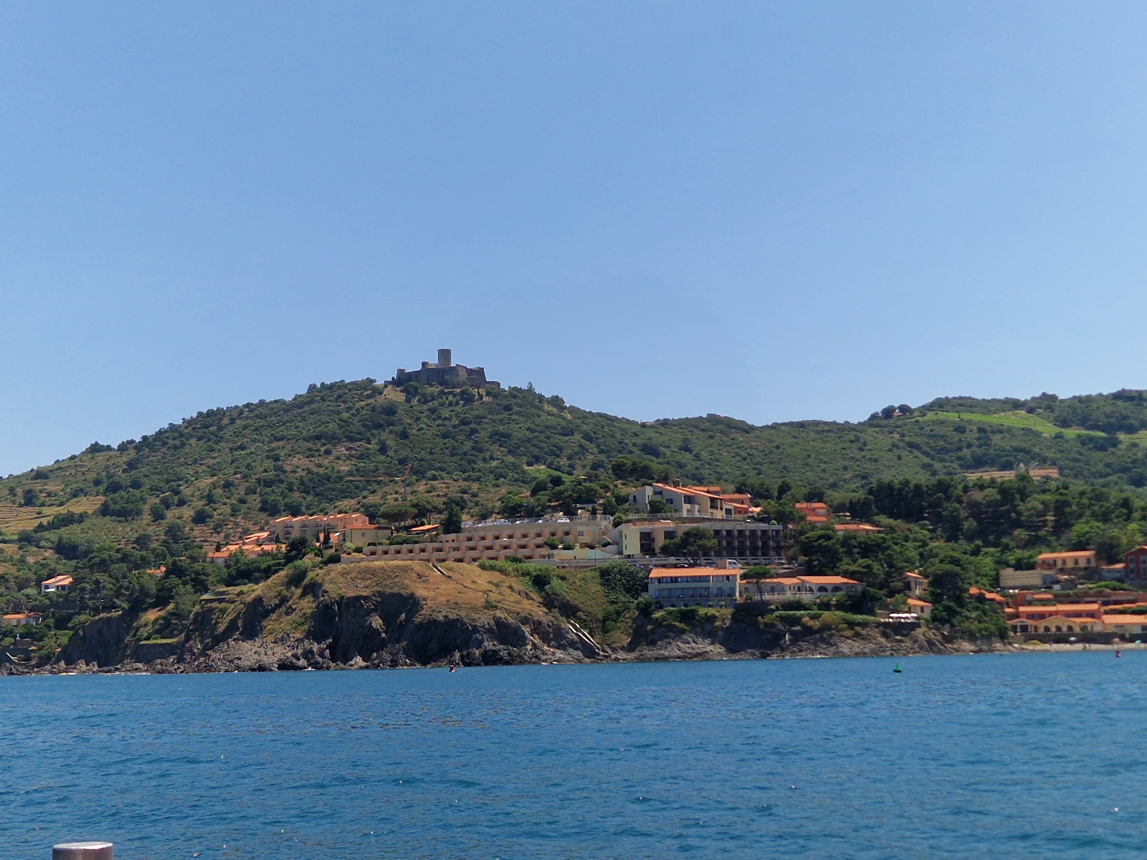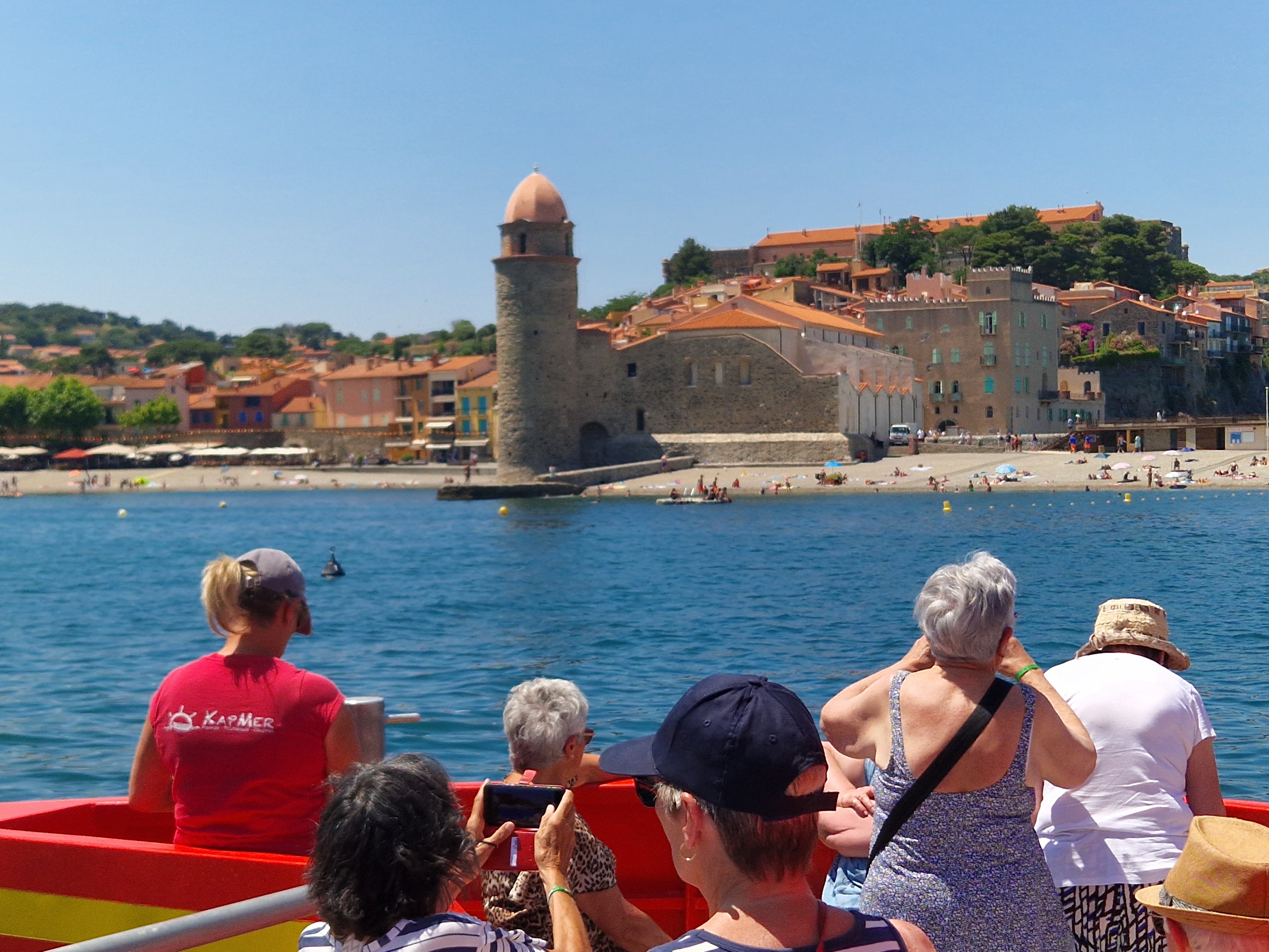 In het rode bootje doen we als eerste Collioure aan. Een vrolijke bemanning vertelt van alles wat ik snel vergeet. Iets over het bijzondere witte open gebouwtje waar de beeldend kunstenaars die naar Collioure kwamen hun “salon” (tentoonstelling) inrichten, iets over het fort. Zwaluwtjes bakkeleien met de meeuwen rond de torens, de terrassen zitten vol dagjesmensen.