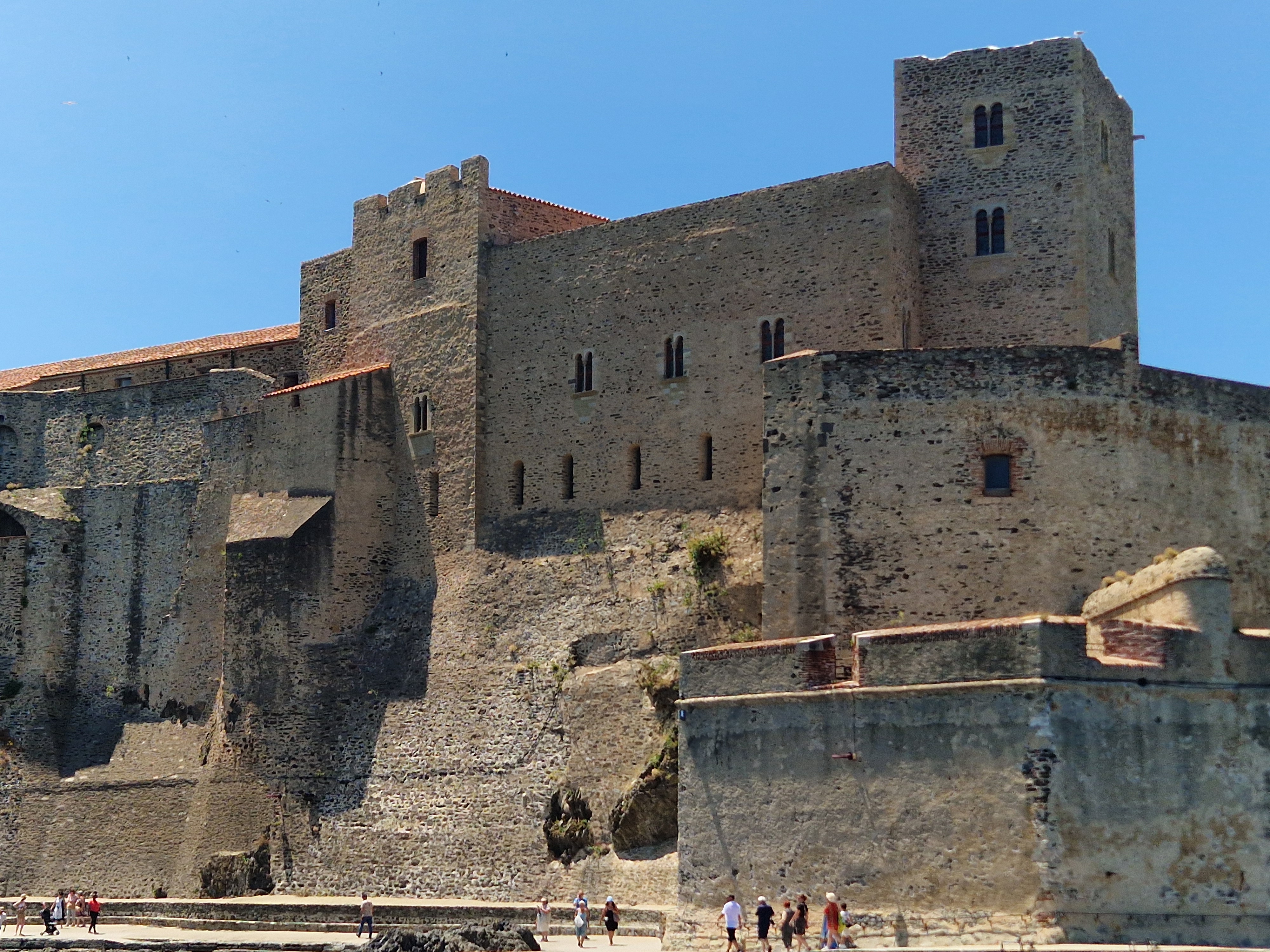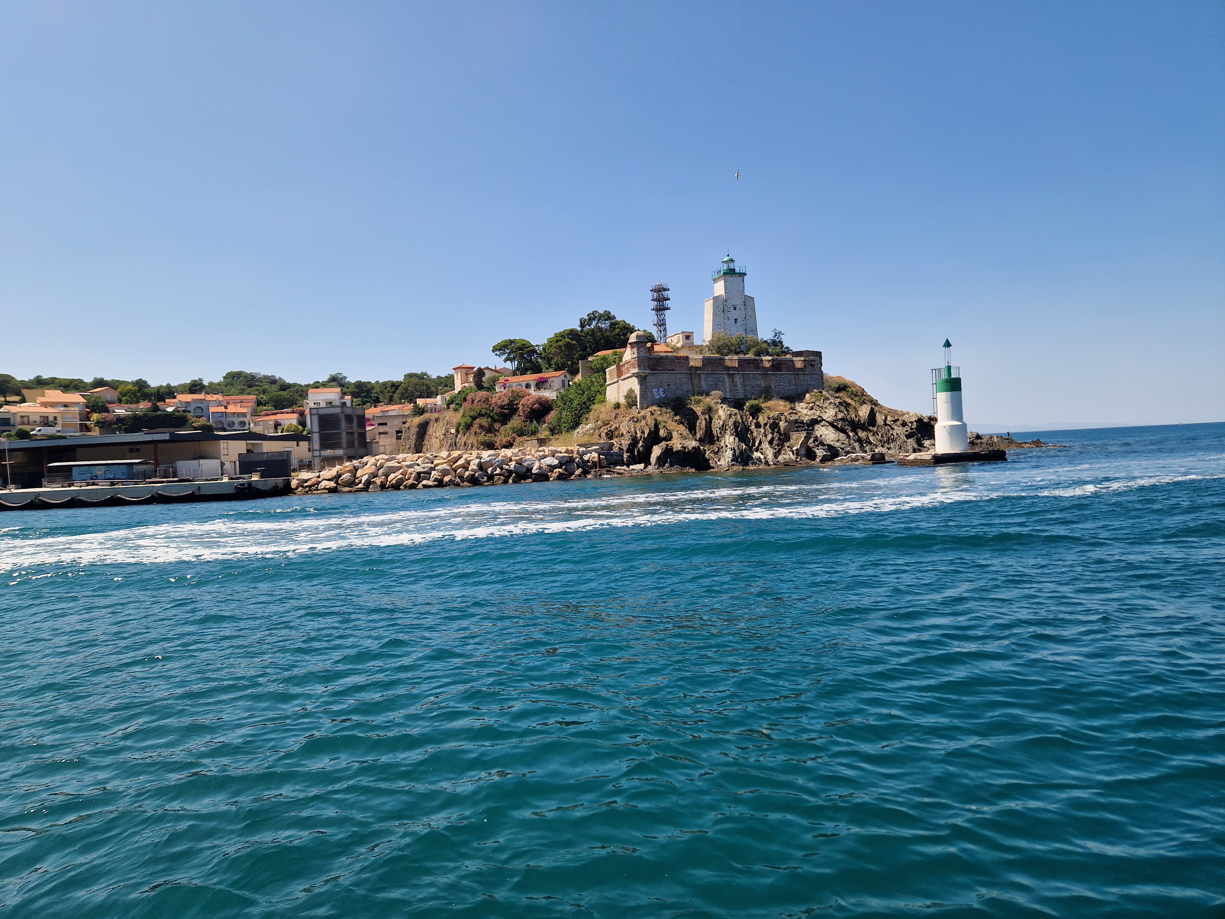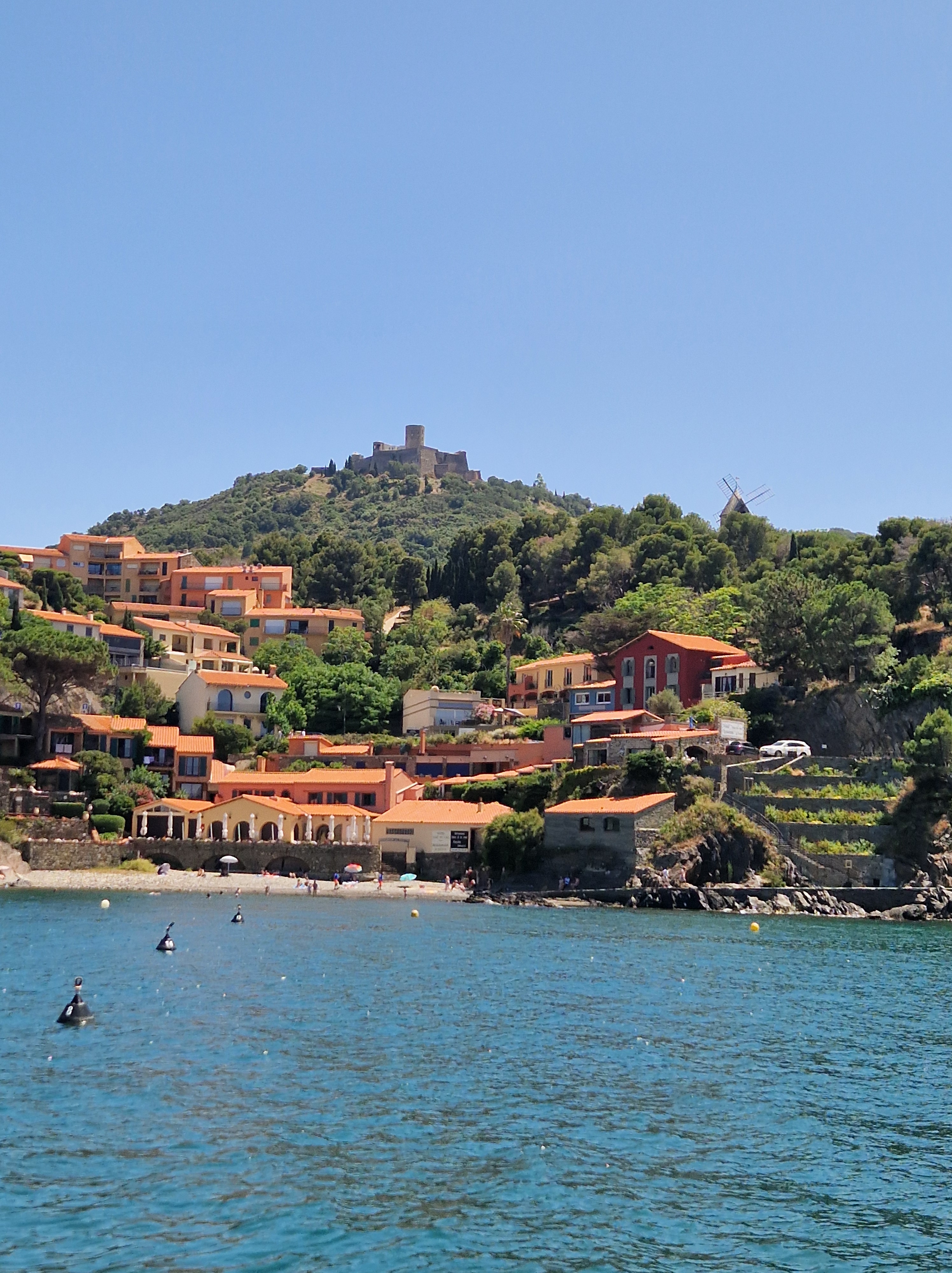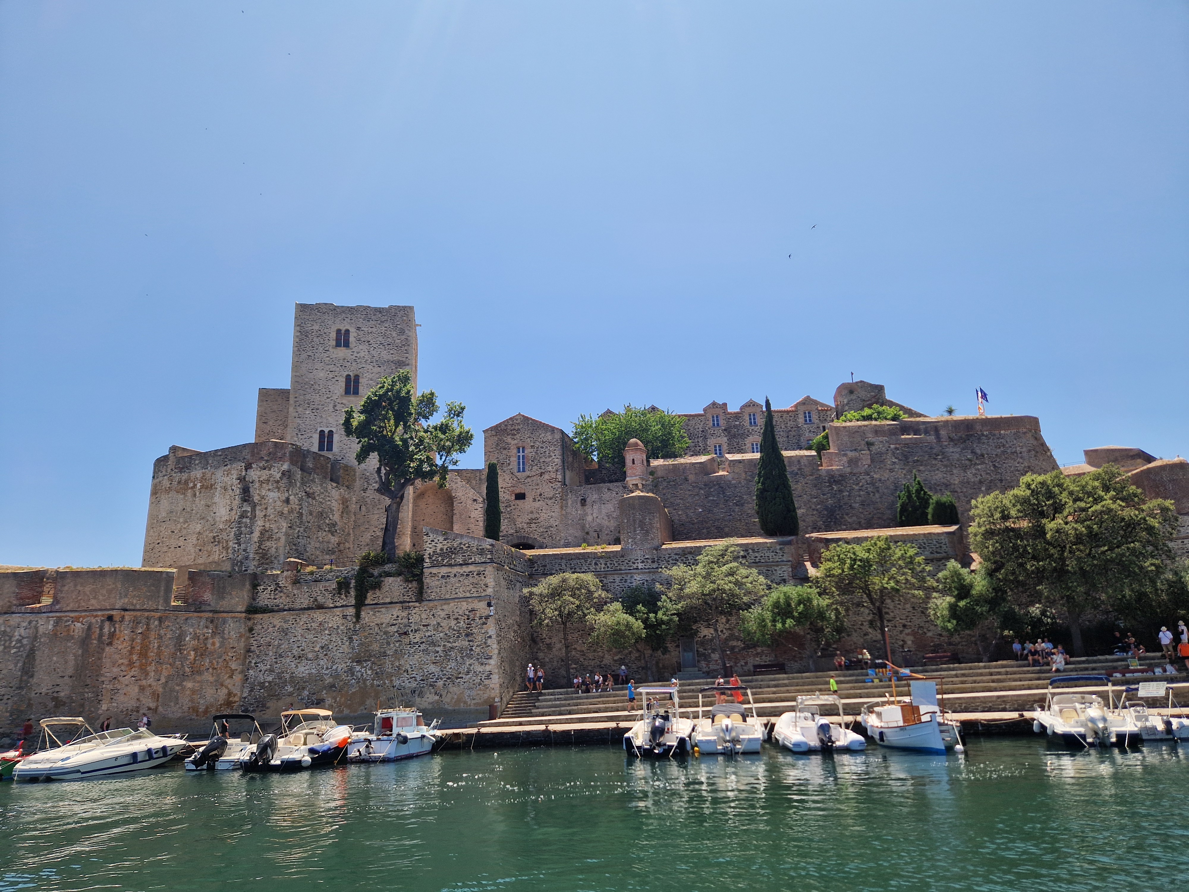 In het rode bootje doen we als eerste Collioure aan. Een vrolijke bemanning vertelt van alles wat ik snel vergeet. Iets over het bijzondere witte open gebouwtje waar de beeldend kunstenaars die naar Collioure kwamen hun “salon” (tentoonstelling) inrichten, iets over het fort. Zwaluwtjes bakkeleien met de meeuwen rond de torens, de terrassen zitten vol dagjesmensen.
