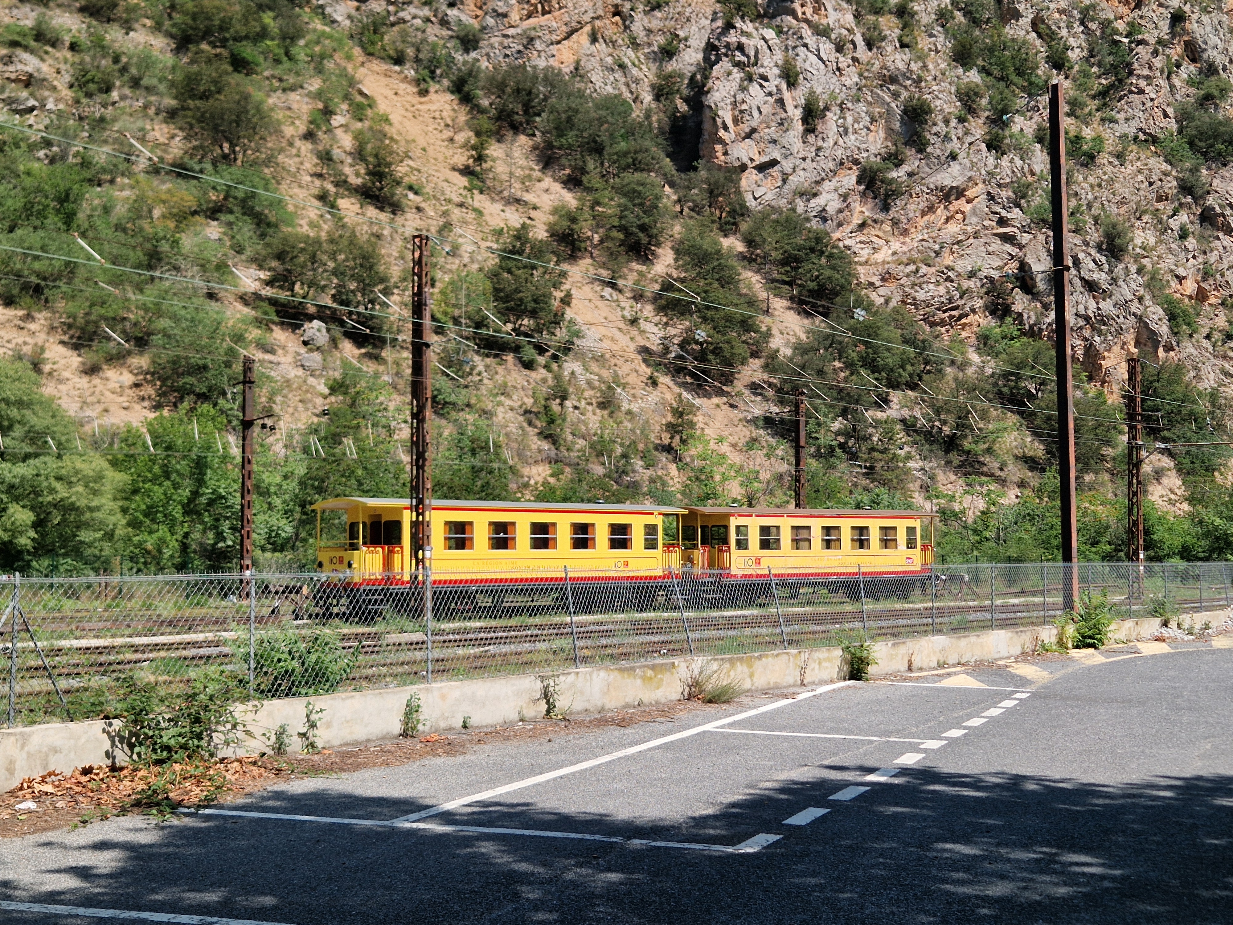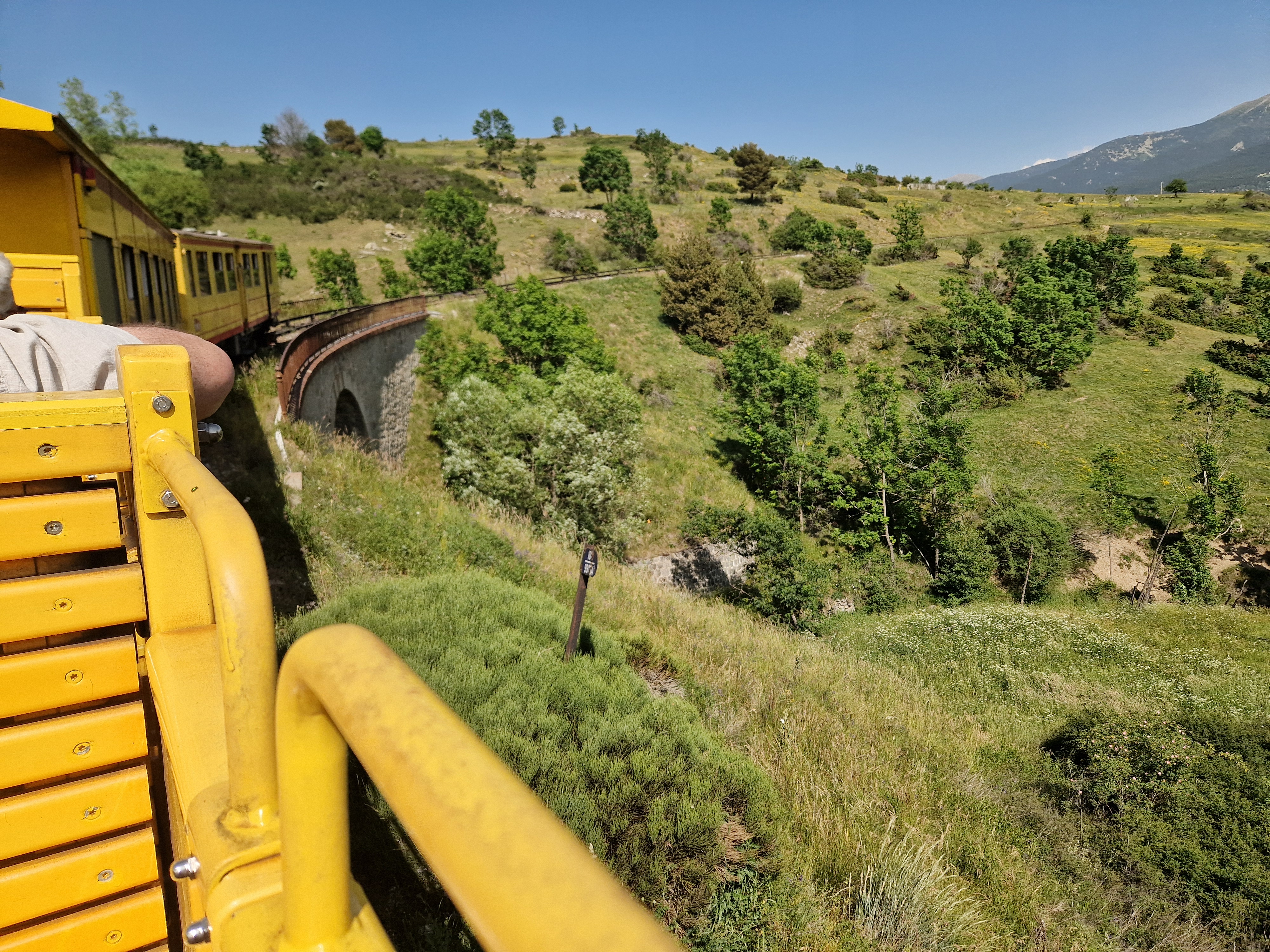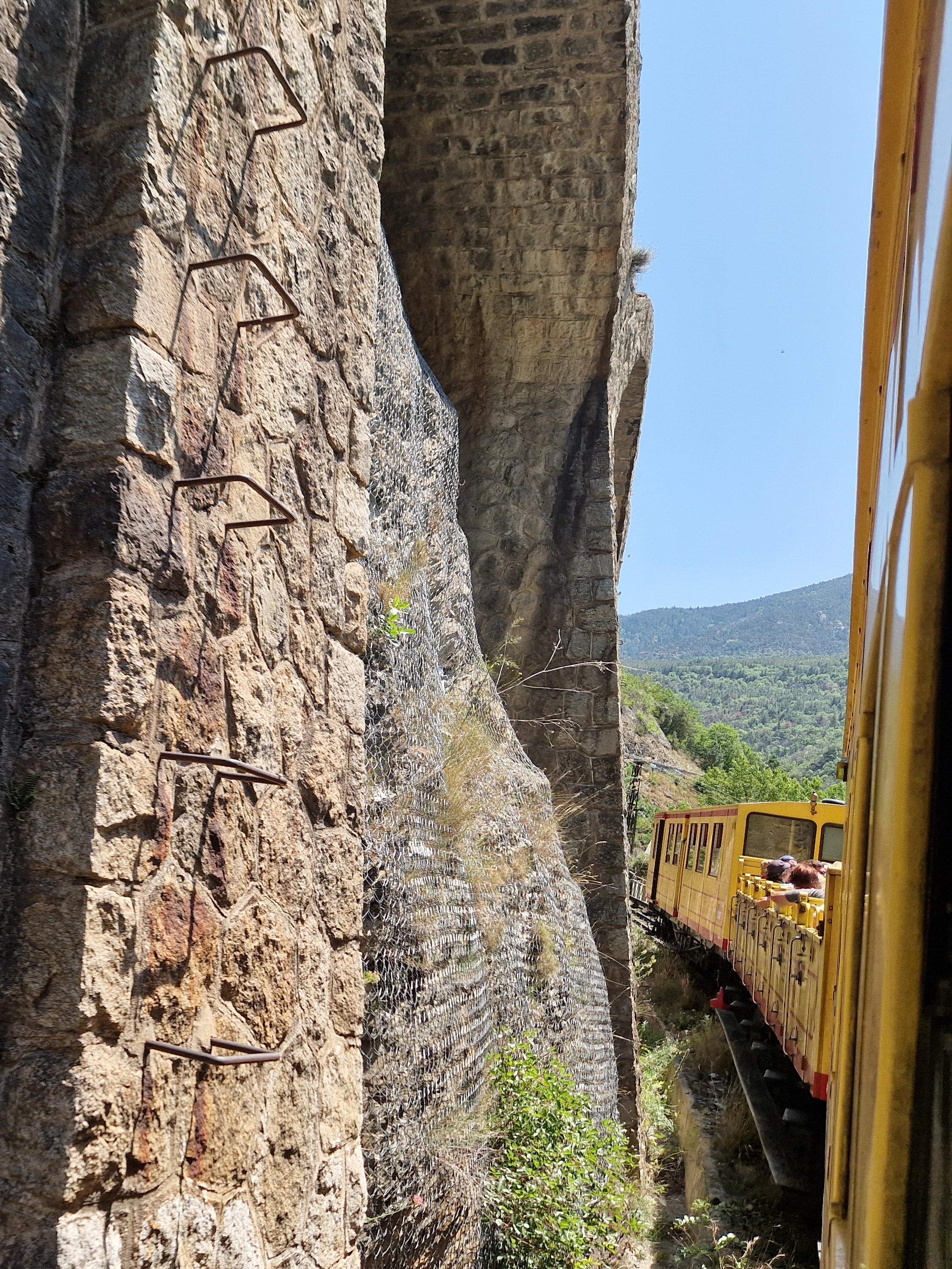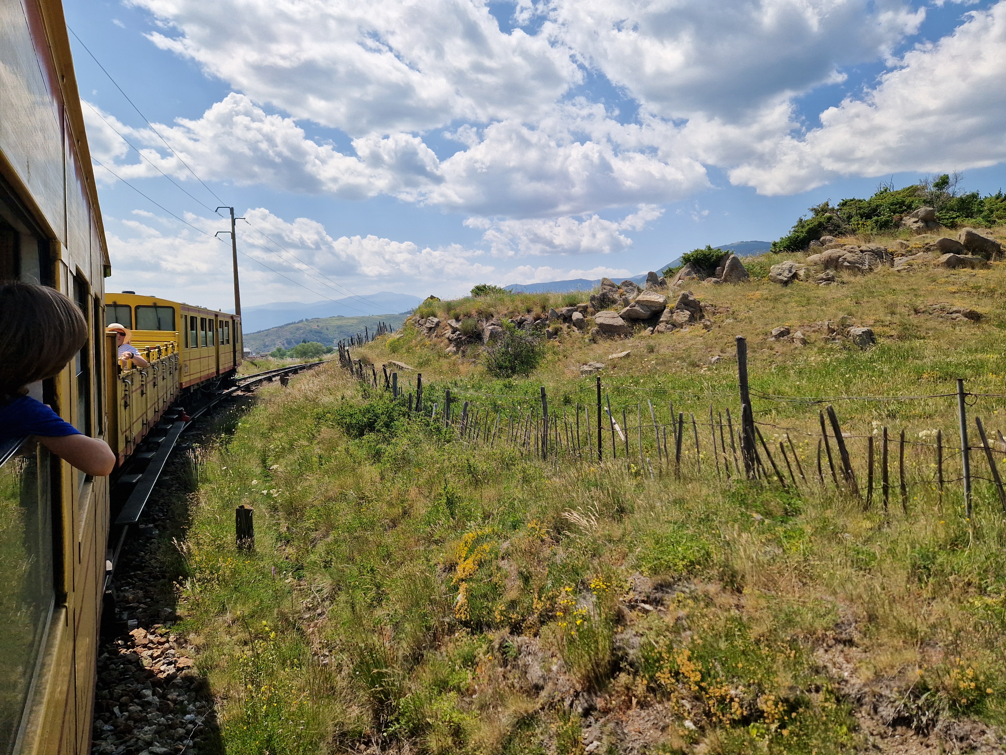 De heenrit zitten we binnen. De trein zit vol Fransen, wij zijn de enige buitenlanders. Tunnels en bruggen worden door een jongetje dat met Papy et Mamie op pad is en met zijn hoofd uit het raam hangt, luidkeels aangekondigd. “Tunnèl, tunnèl! Pont! Pont!” Zijn guitig smoeltje met roetvegen op de wangen glundert van pret. Op onmogelijk kleine stationnetjes stoppen we af en toe om een tegemoetkomende boemel te laten passeren.