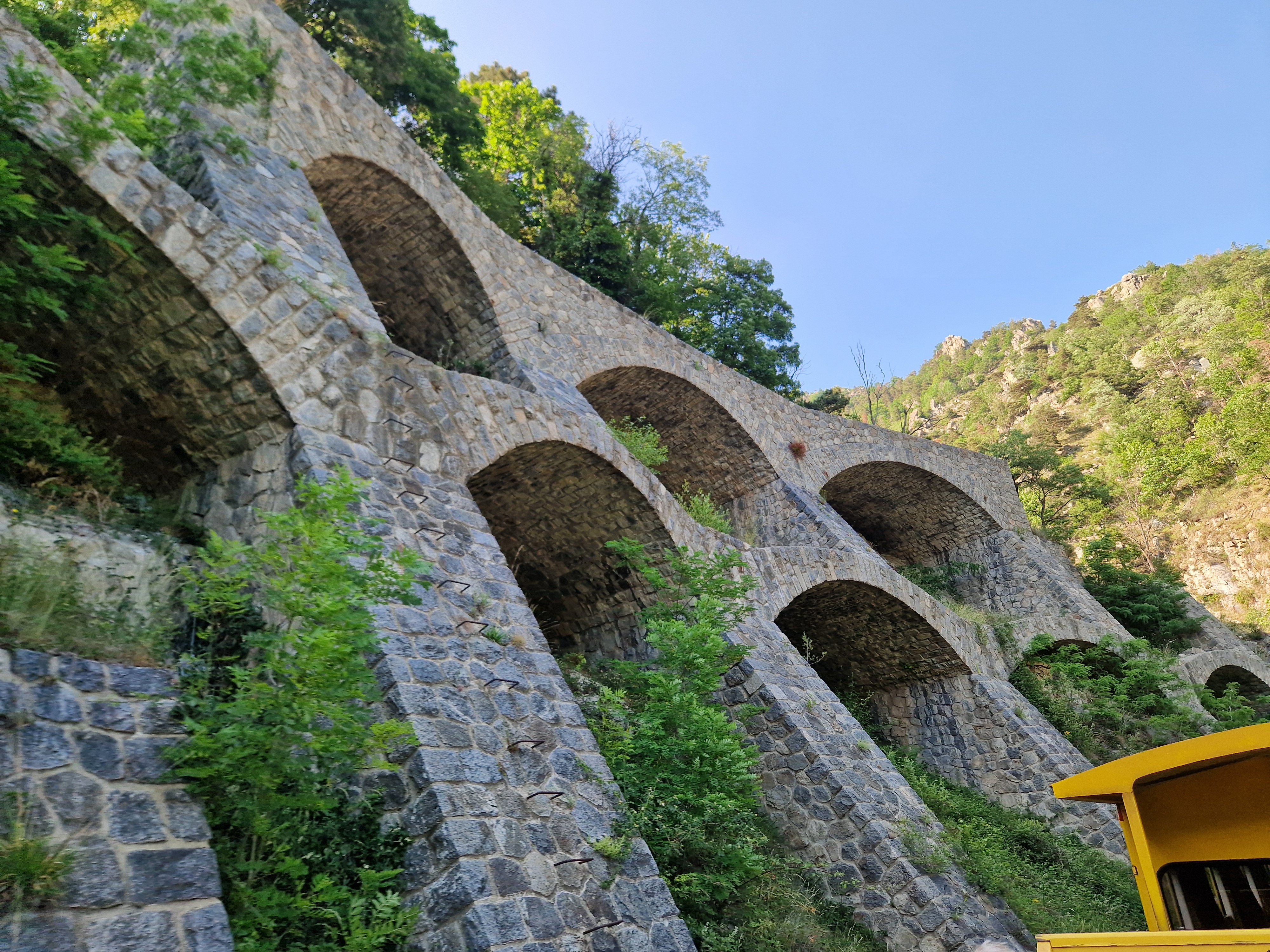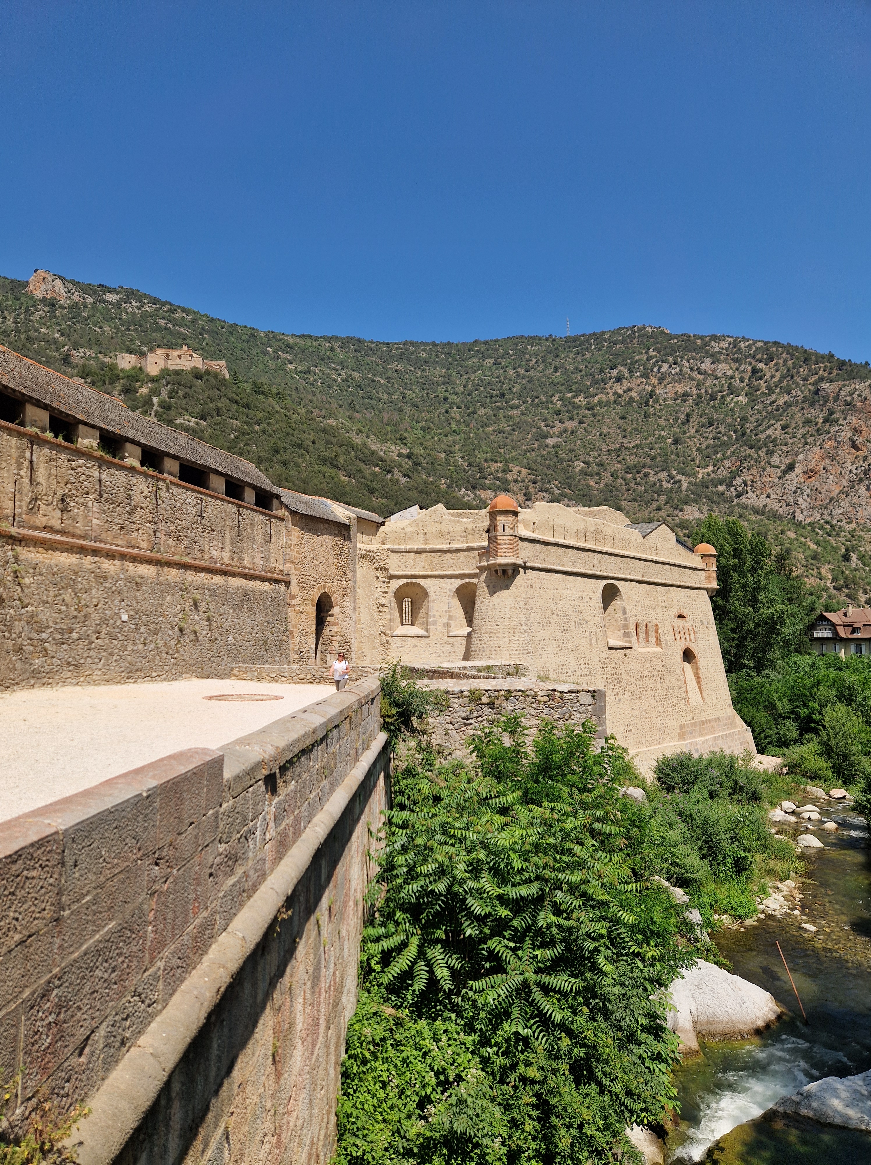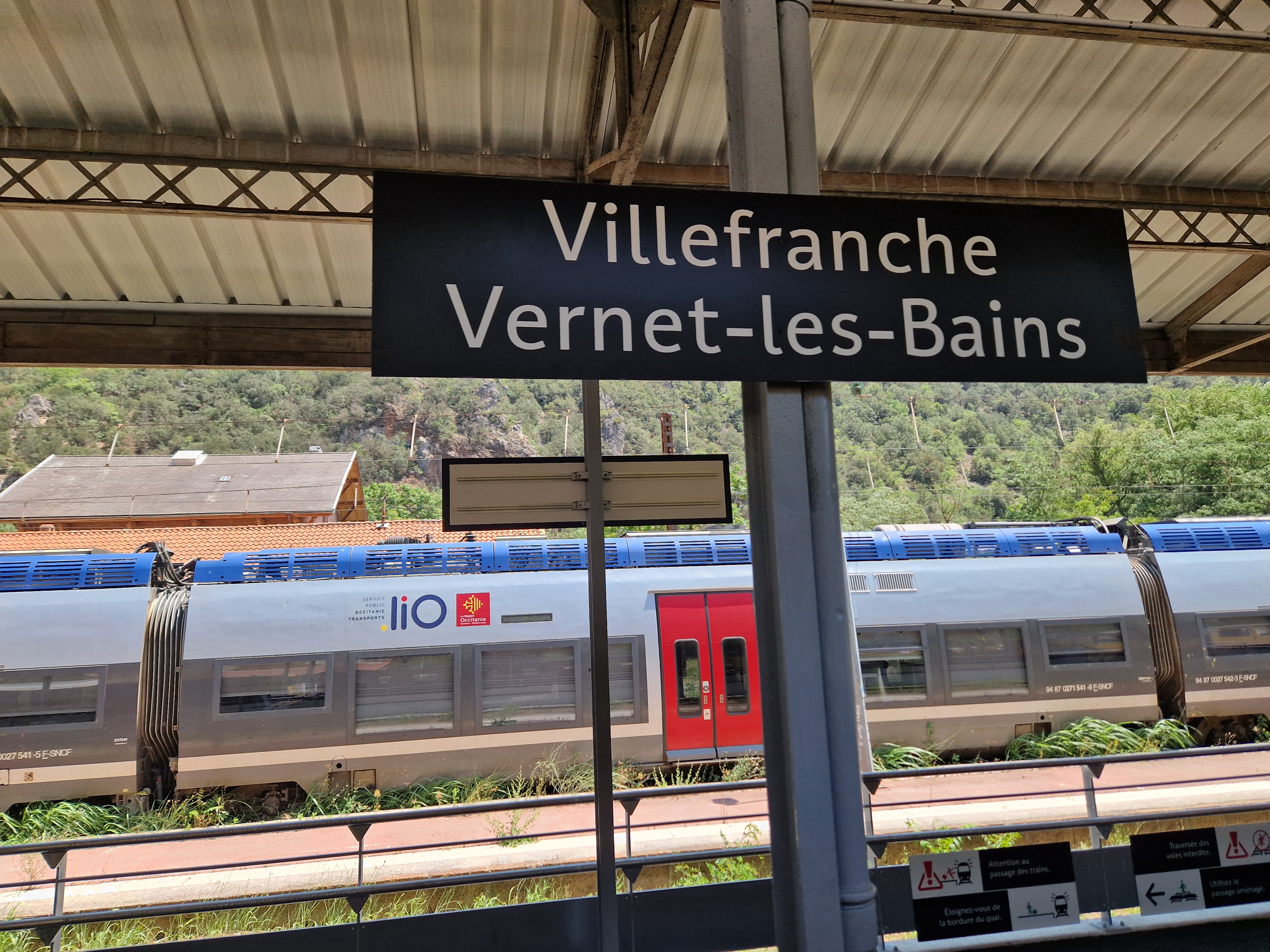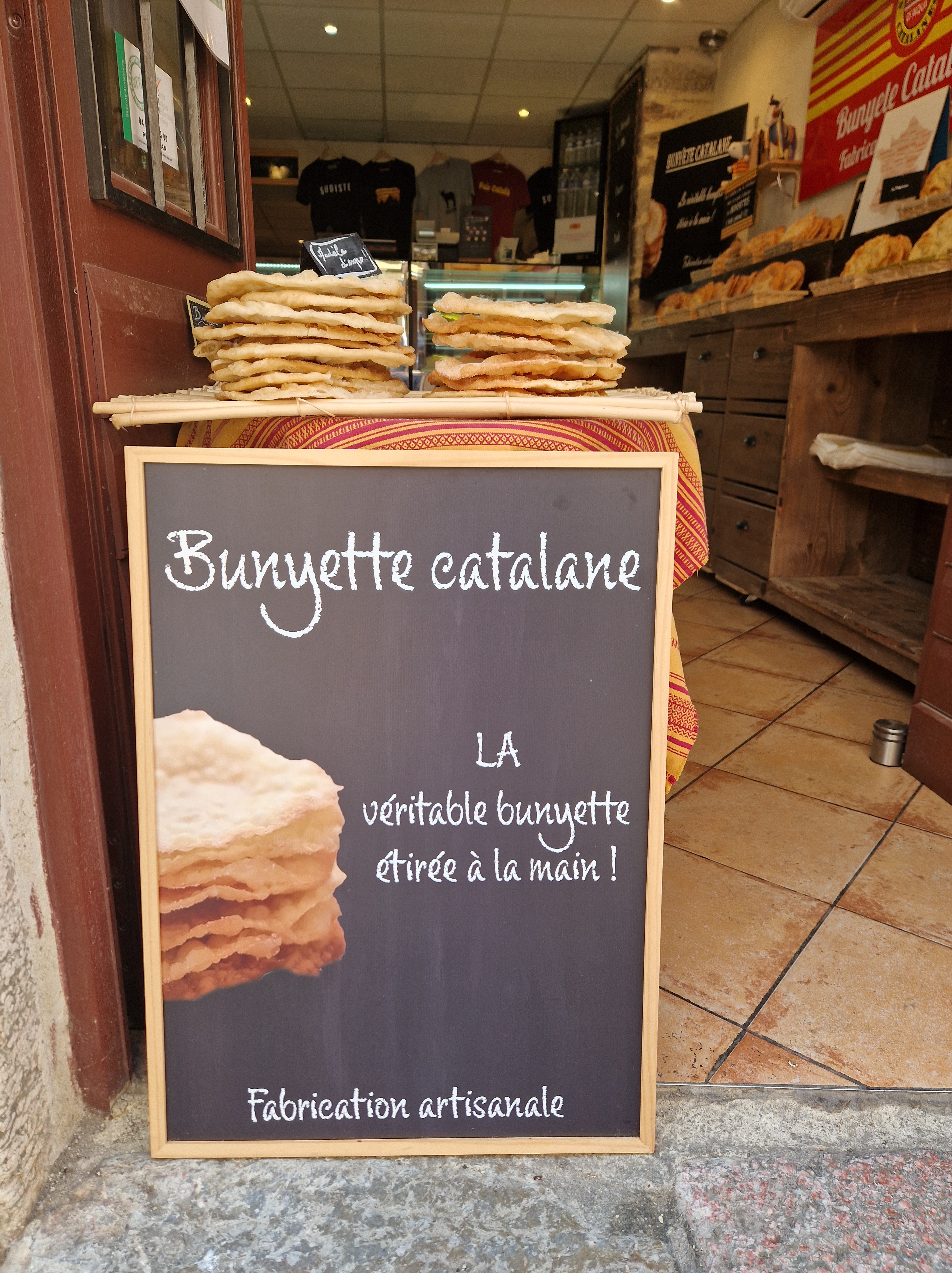 Met de Train Jaune, het gele toeristendieseltje, doen we de volgende dag een retourtje Villefranche-de-Conflent <> Font-Romeu-Odeillo-Via. Zo, da’s een mond vol. De namen klinken toch nèt iets anders dan ‘Naarden-Bussum’ of ‘Purmerend-Overwhere’. In Villefranche hebben we wat tijd over om rond te wandelen. Kopen Bunyettes Catalanes, heerlijke platbroden als vette snacks met tomaat/basilicum of met suiker. We snoepen er de hele middag van.