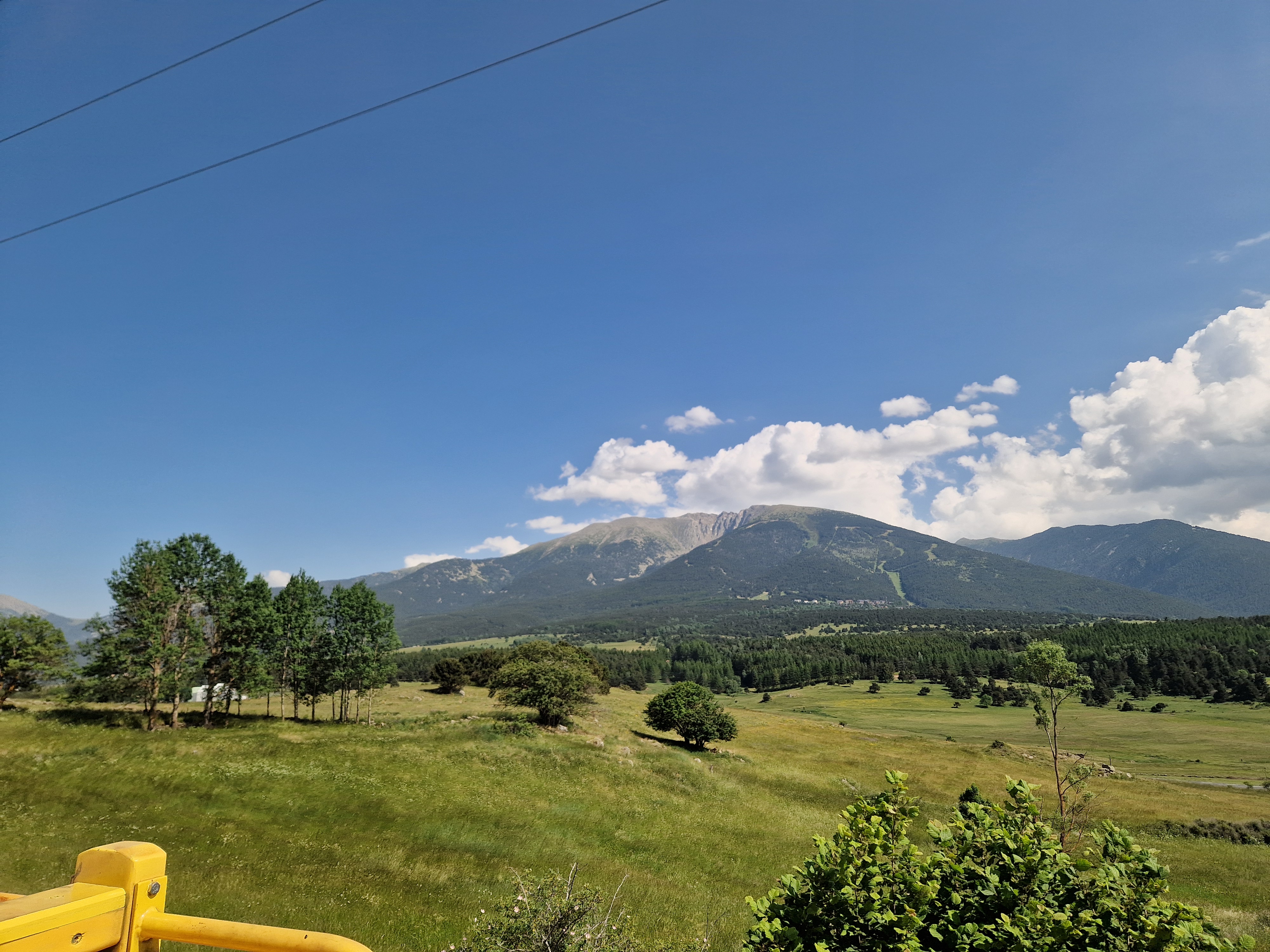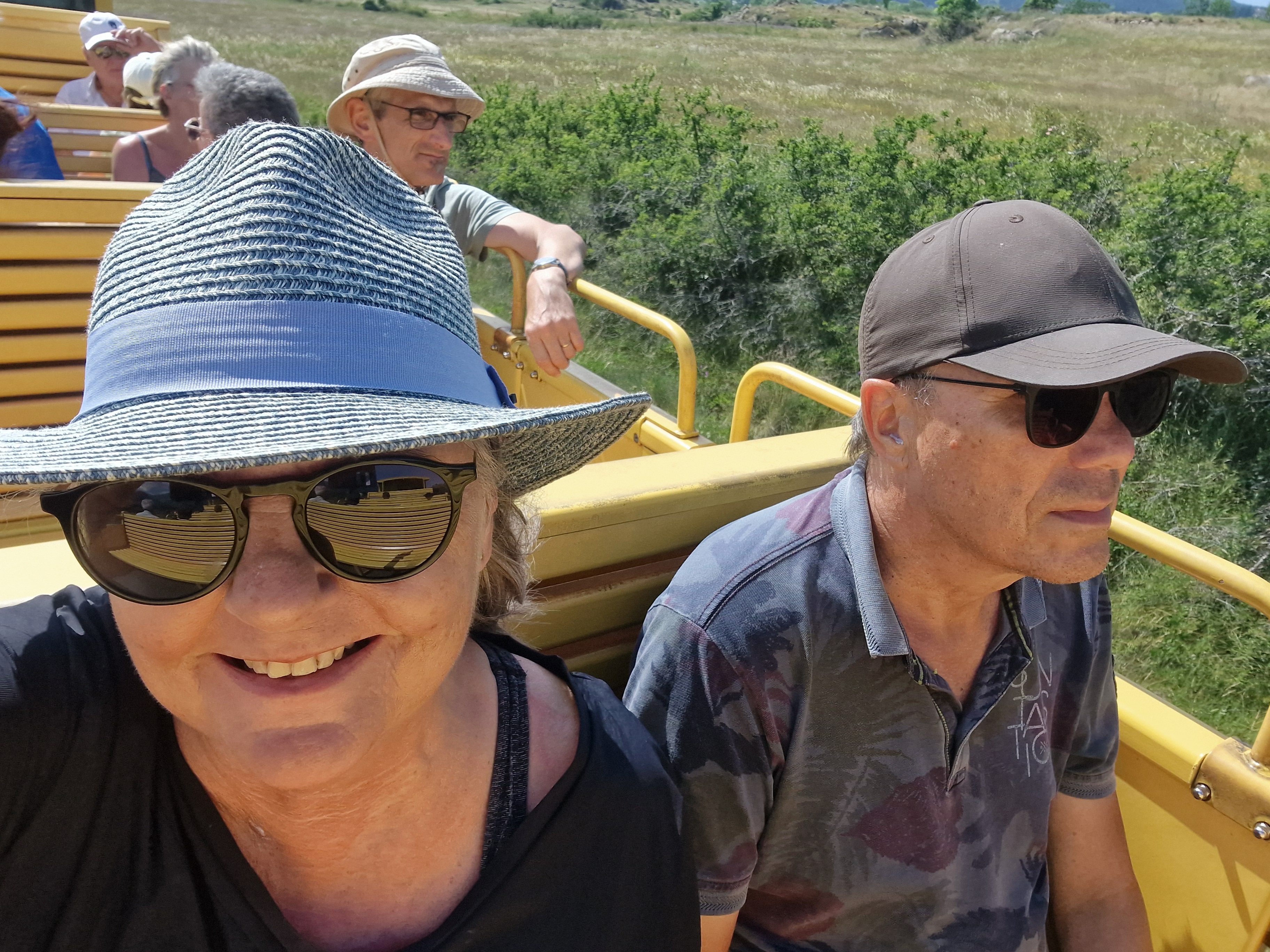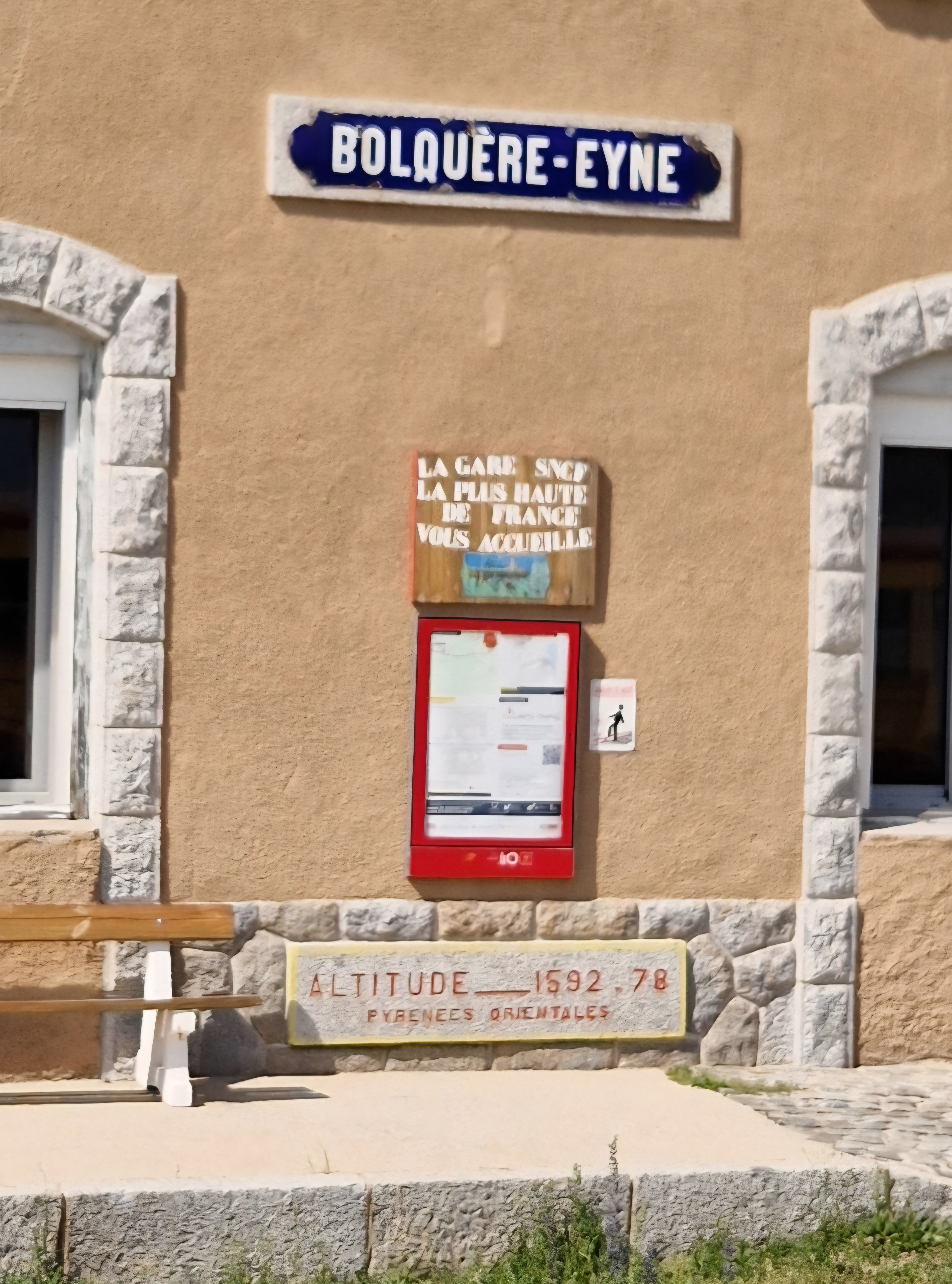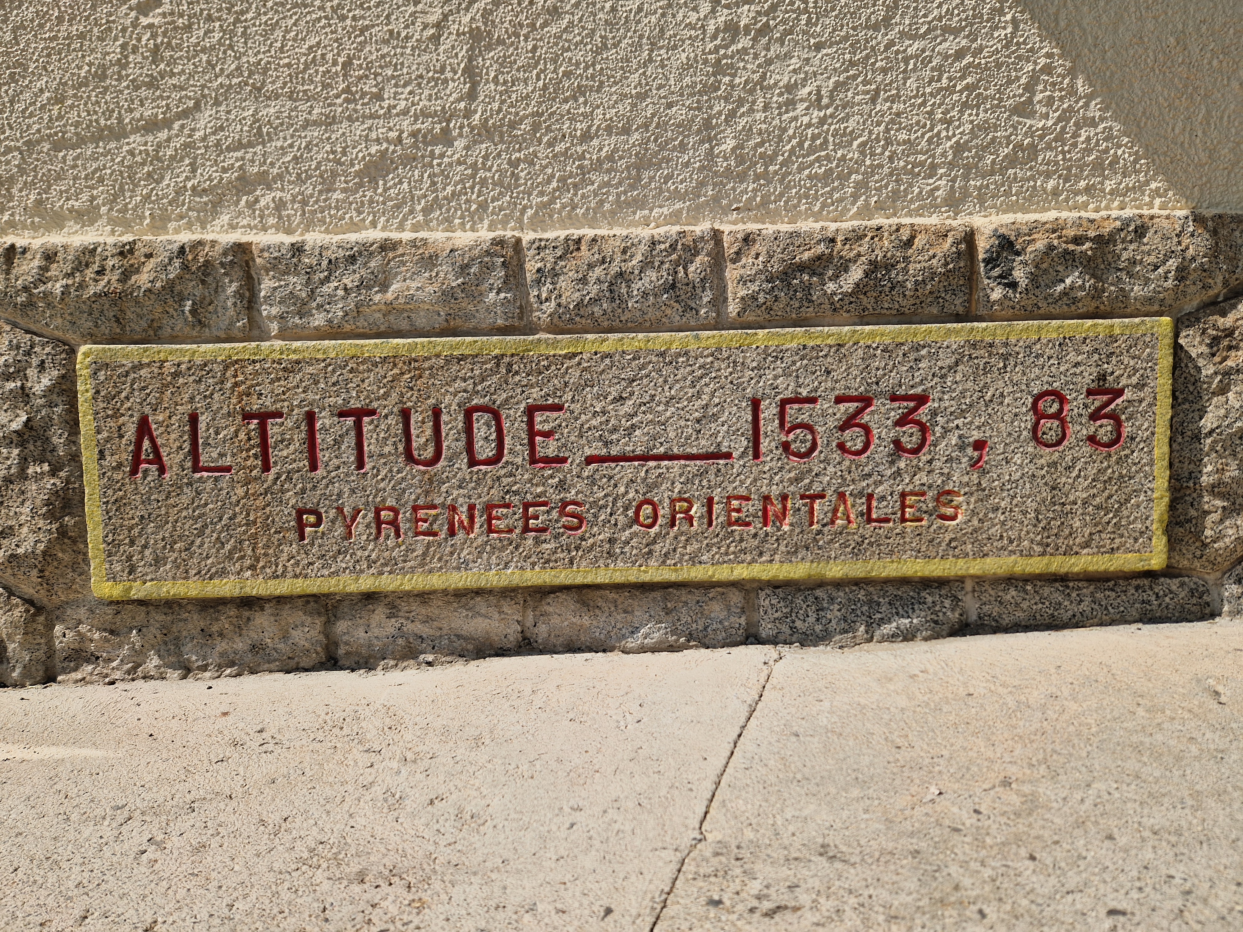 Eenmaal aangekomen bij Font Romeu op ruim 1500 meter hebben we een uurtje rust om frisse lucht te snuiven. Heerlijk is het hierboven, relatief ‘koel’. We lopen richting van de Grand Four Solaire, een grote ‘zonneoven’ van spiegels die iets doen met de zonnewarmte. We zien niet veel van het bouwsel en hebben tijd noch zin om het nader te onderzoeken. Op de terugweg zitten we in het open compartiment, een ander soort oven, waar we levend verbranden maar genieten van de uitzichten.