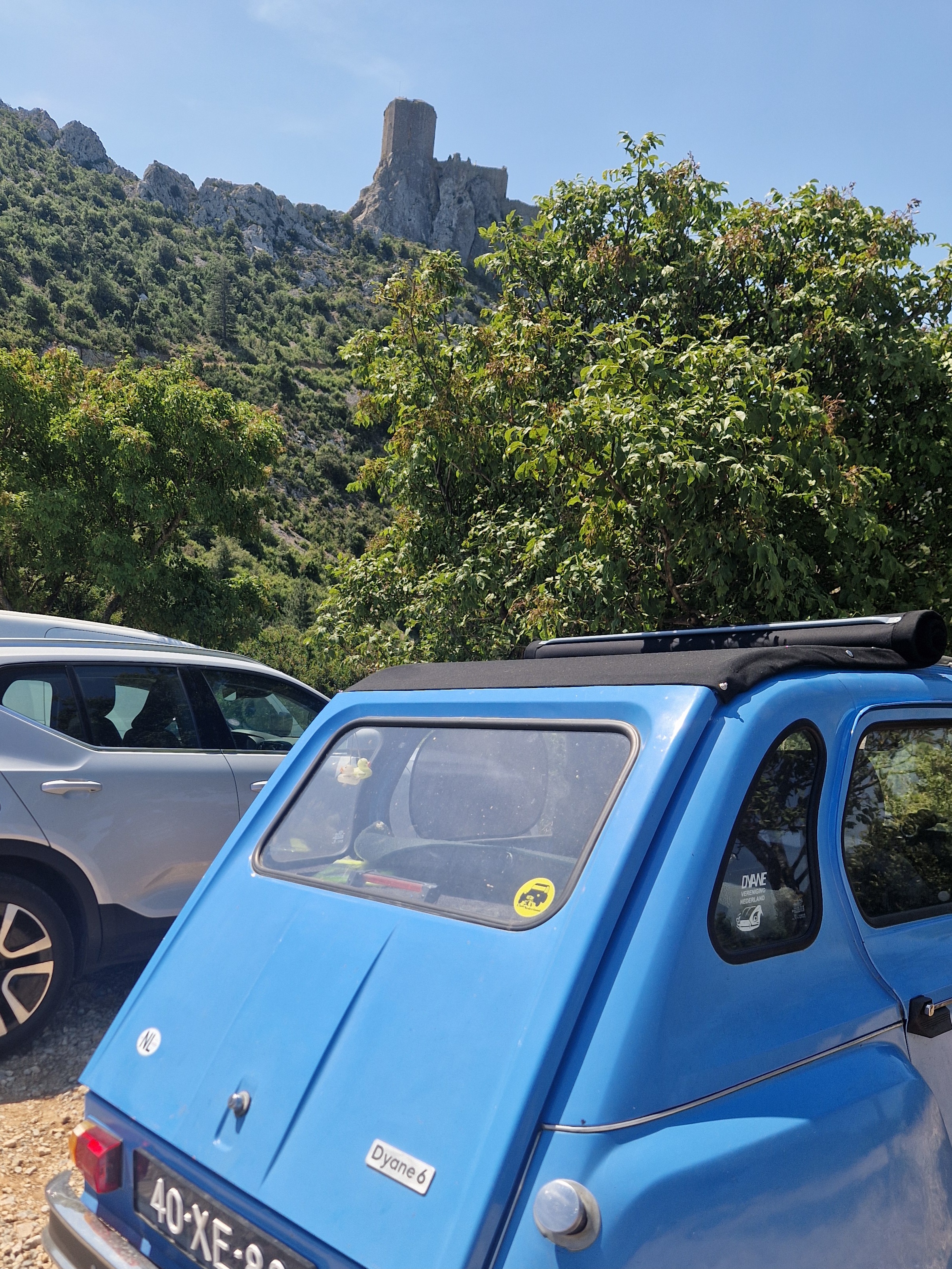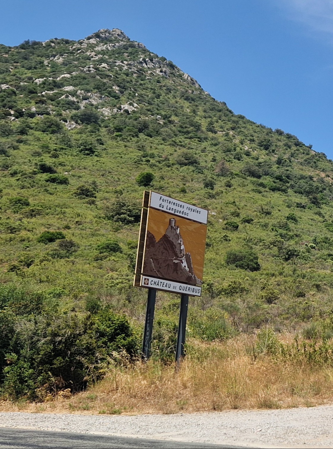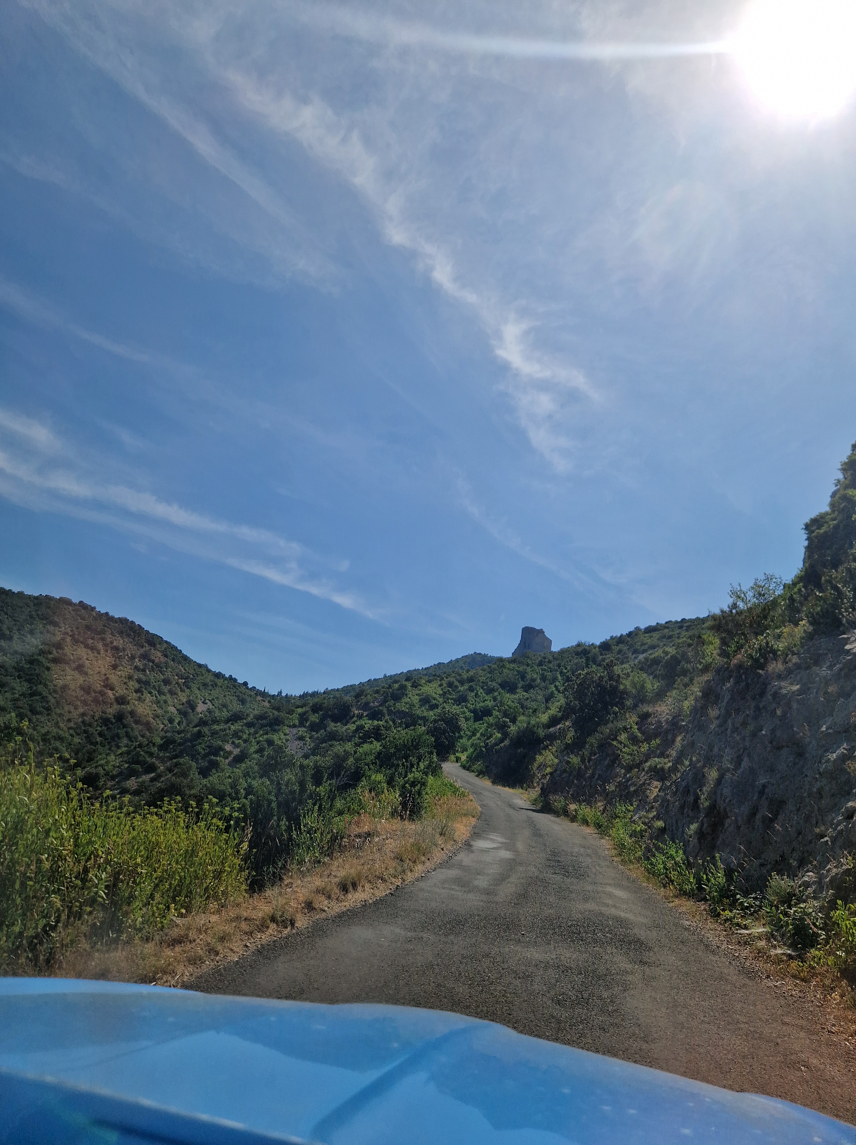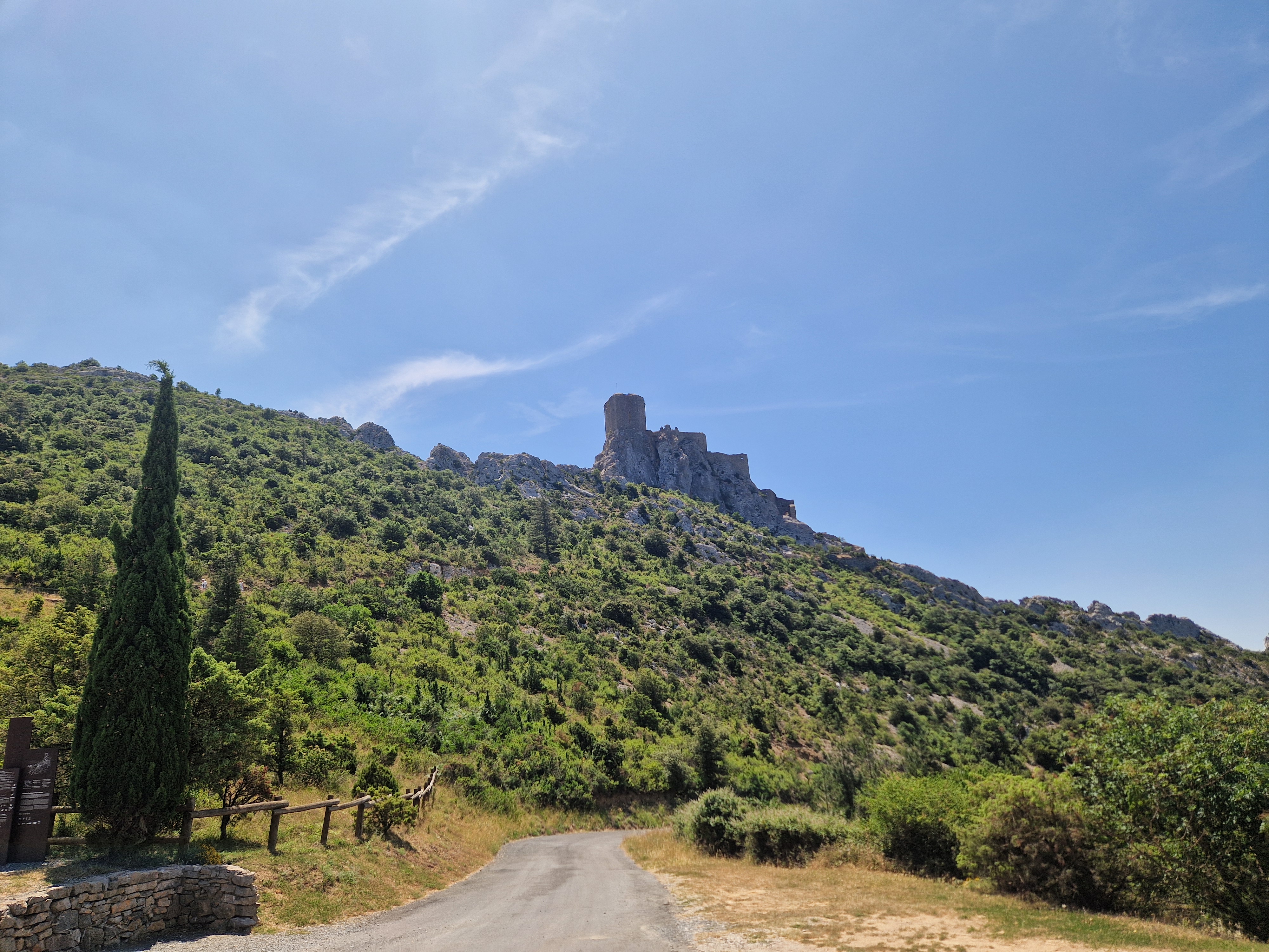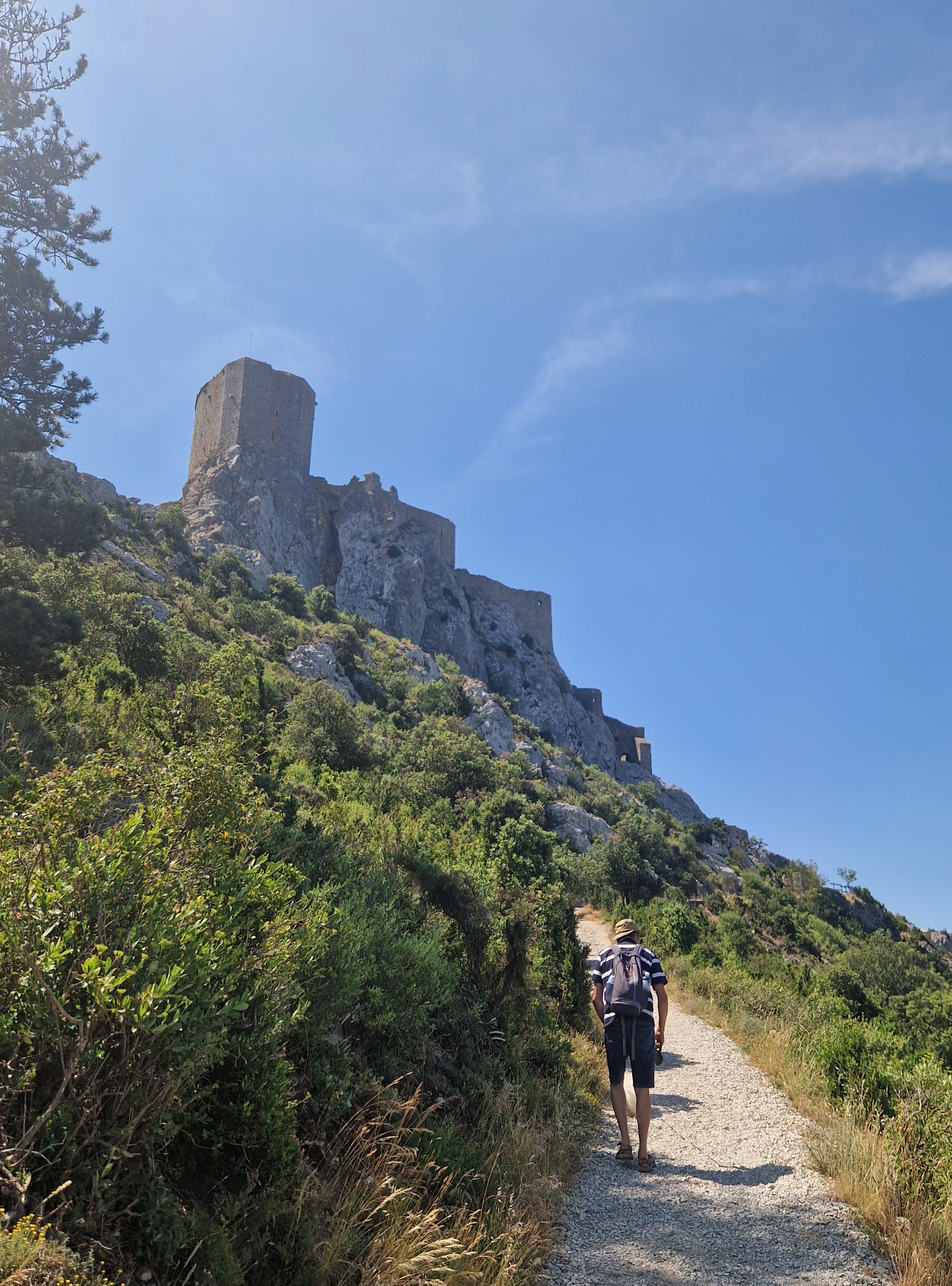 Oké, we zijn uitgerust, wat staat er nu op de planning? Je kunt niet naar de Pyreneeën zonder een kasteel te bezoeken. De dichtstbijzijnde is Quéribus, één van de Katharenburchten. We volgen grotendeels het spoortraject van le petit train rouge, het rode treintje dat zich door Katharenland, de Pays Cathares et Fenouillède, slingert. Met de auto komen we tot aan de voet van het kasteel, verder zullen we moeten lopen.