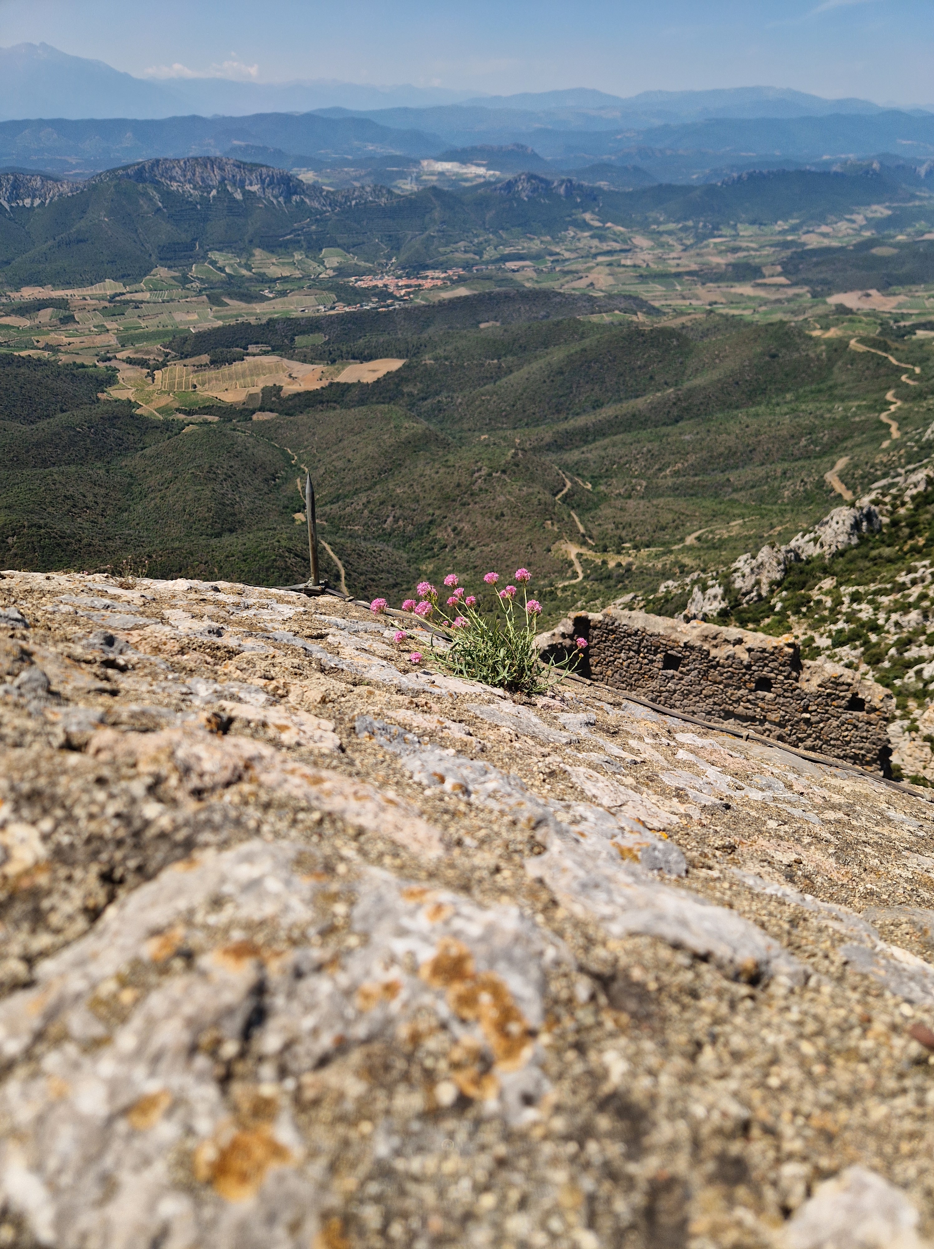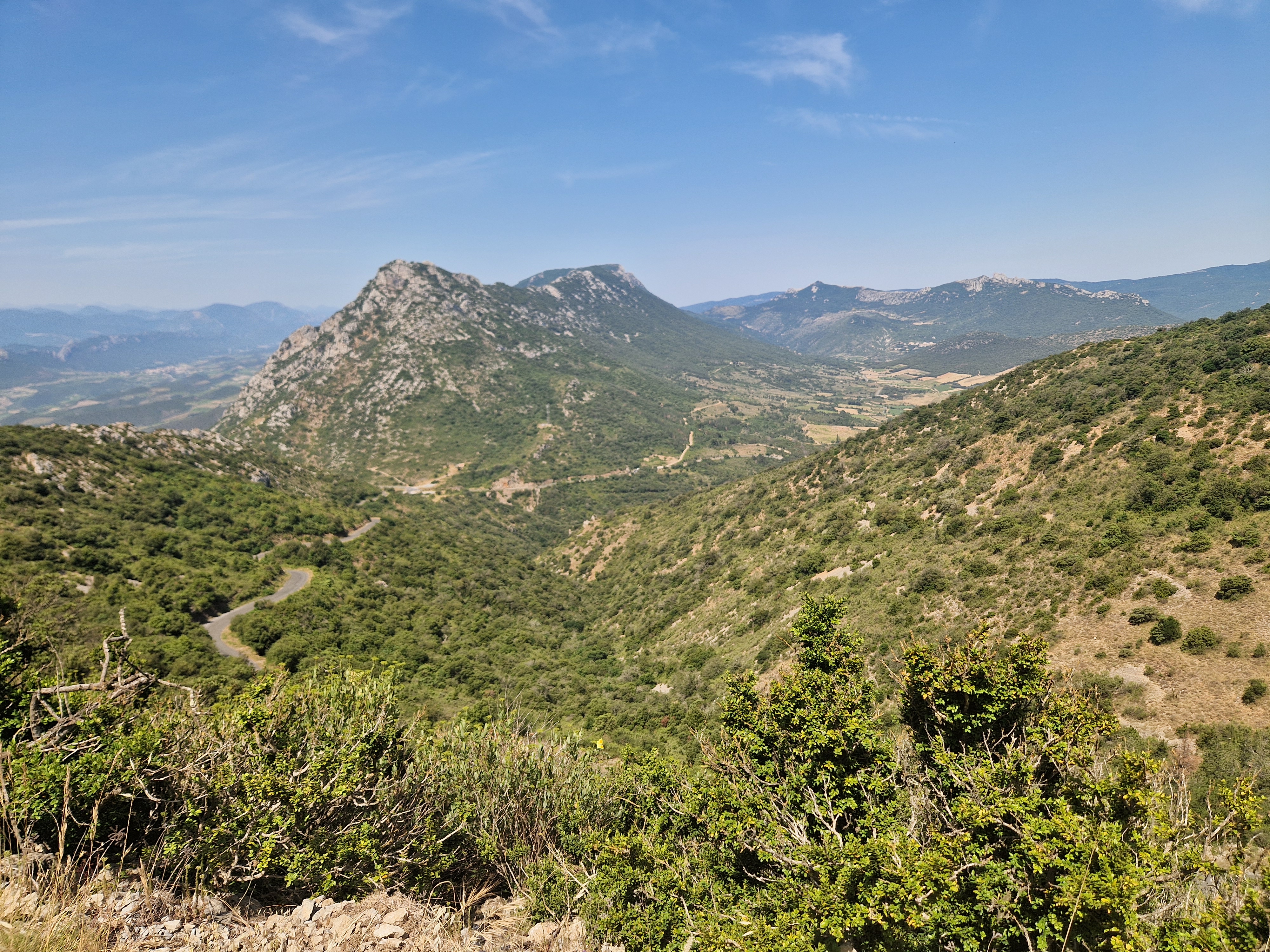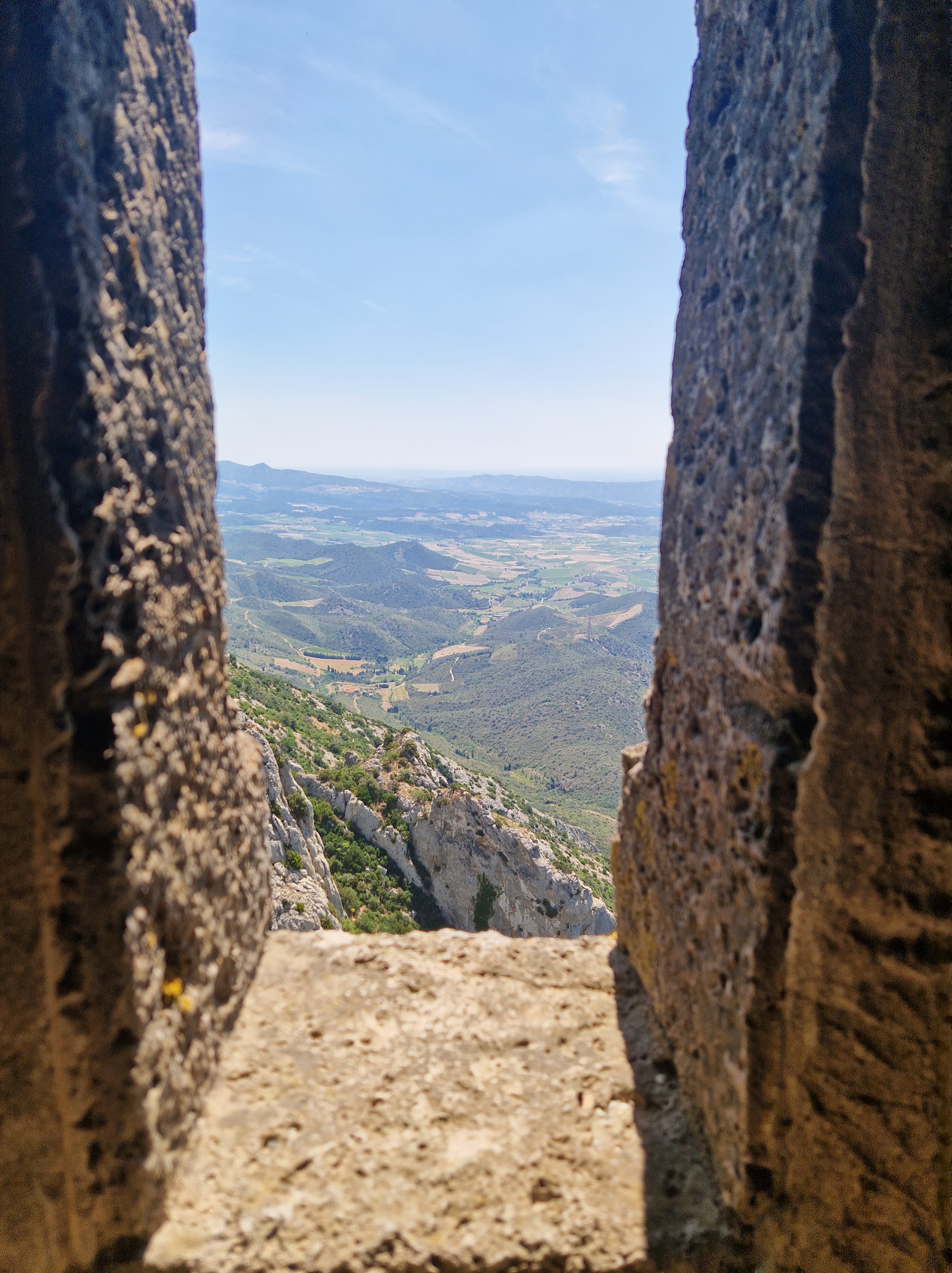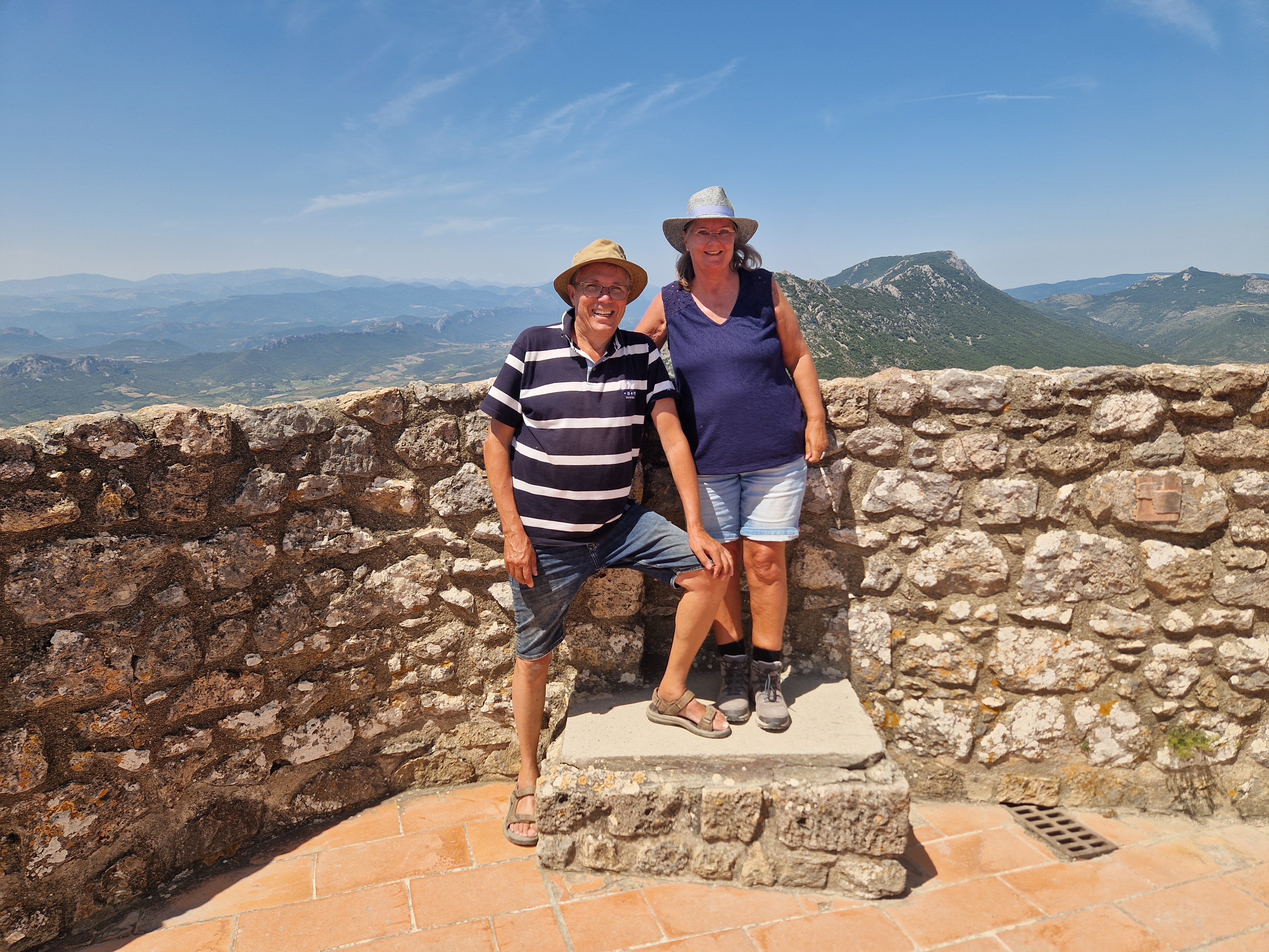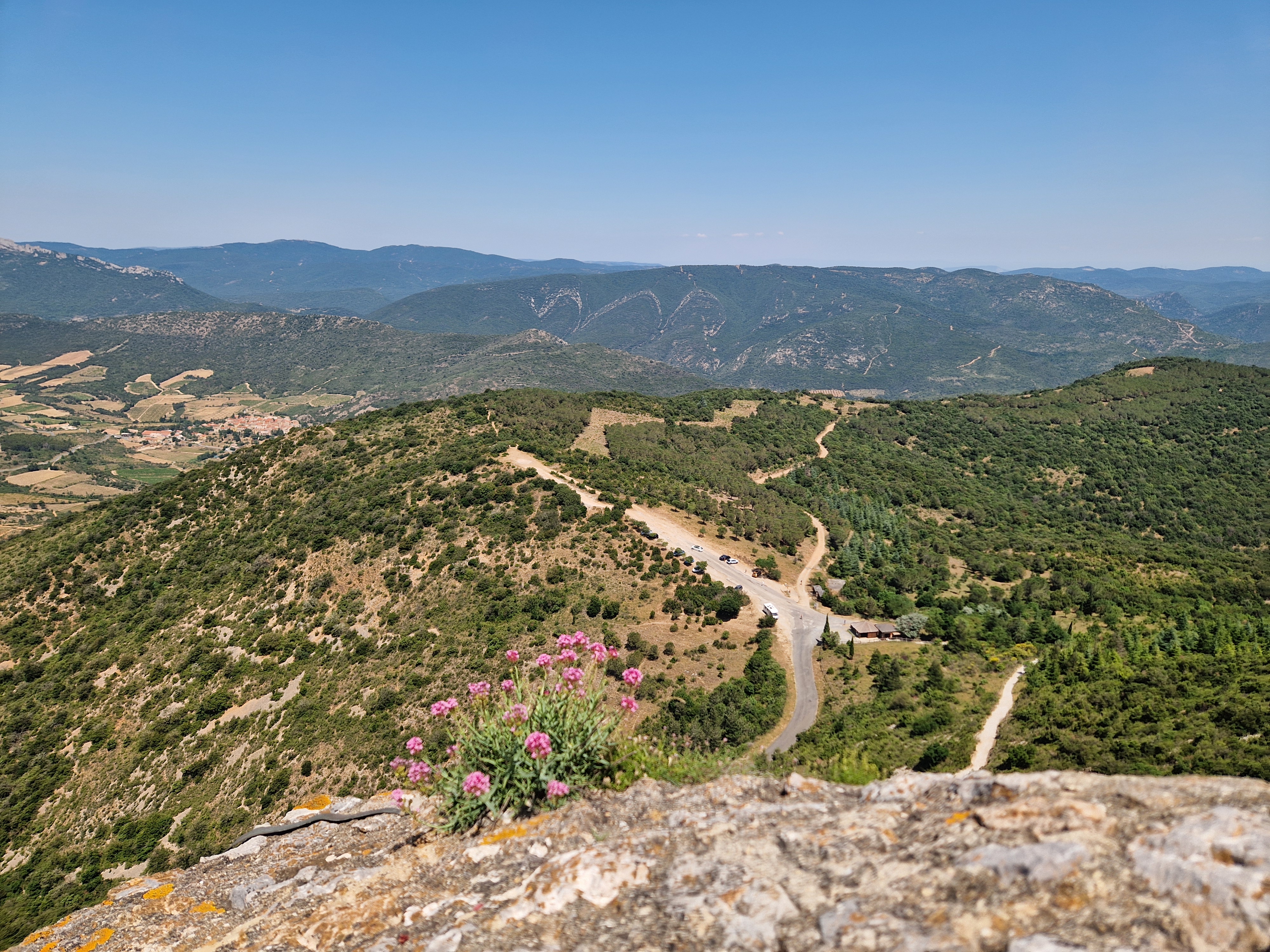 Oké, we zijn uitgerust, wat staat er nu op de planning? Je kunt niet naar de Pyreneeën zonder een kasteel te bezoeken. De dichtstbijzijnde is Quéribus, één van de Katharenburchten. We volgen grotendeels het spoortraject van le petit train rouge, het rode treintje dat zich door Katharenland, de Pays Cathares et Fenouillède, slingert. Met de auto komen we tot aan de voet van het kasteel, verder zullen we moeten lopen.