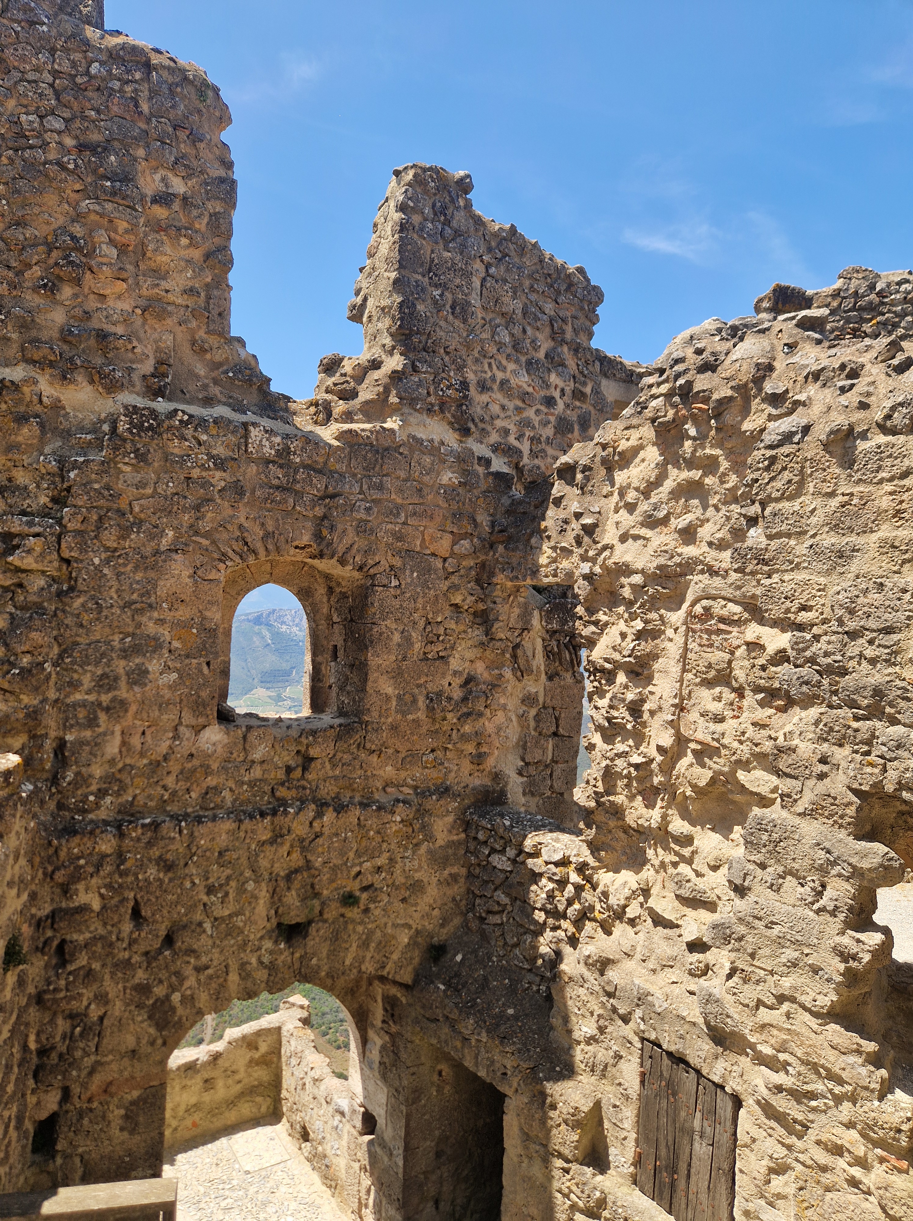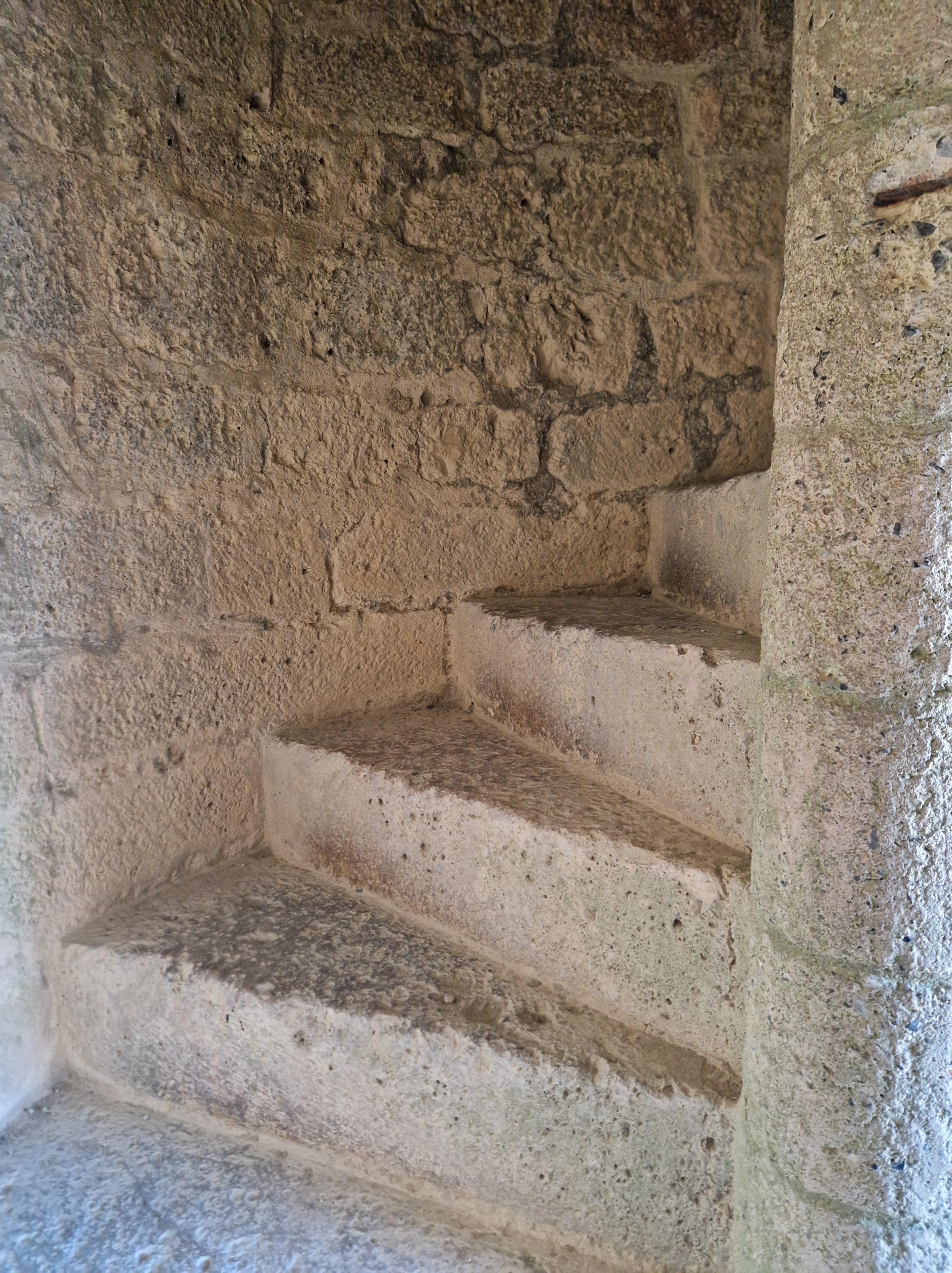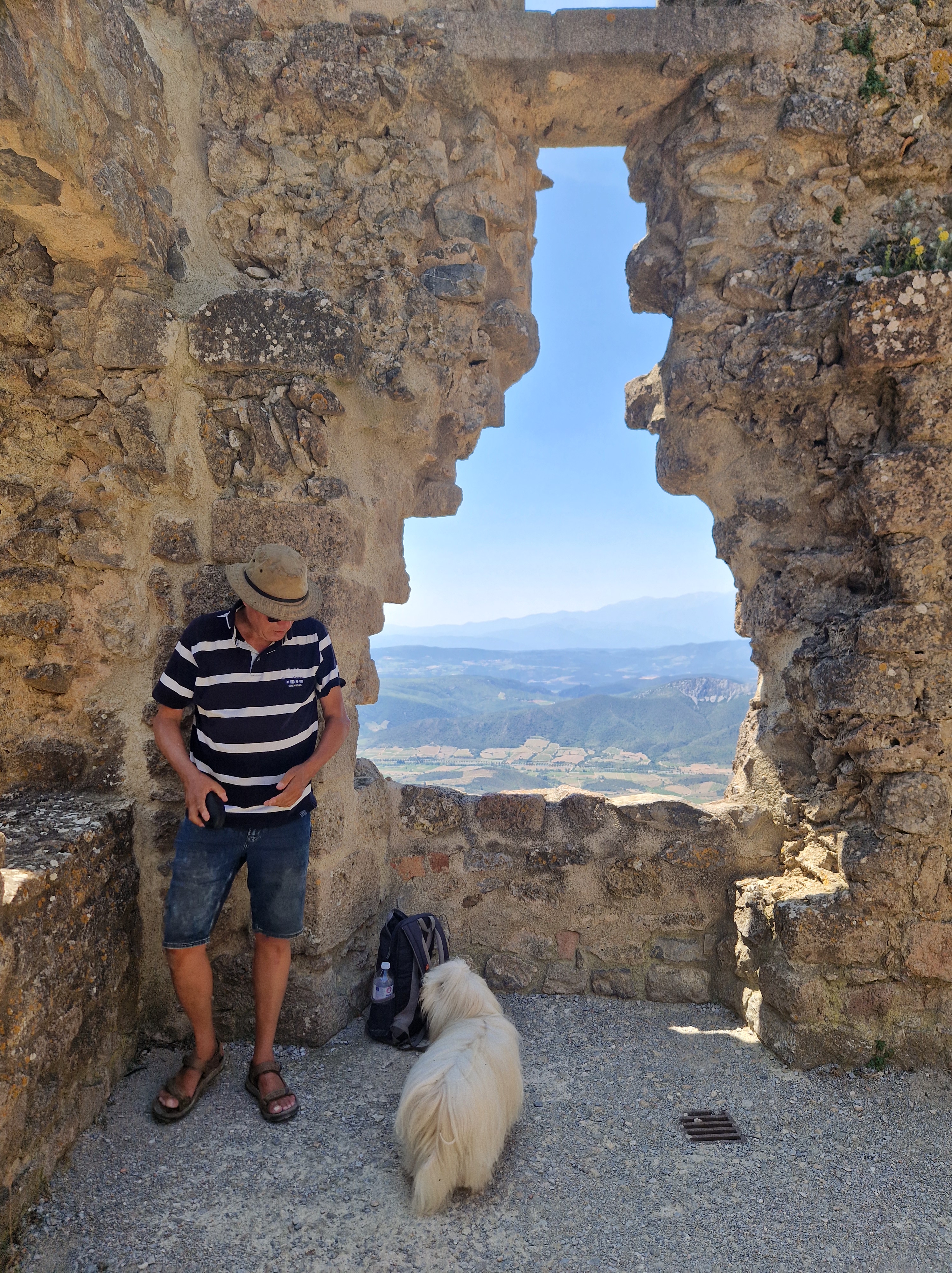 Ik trek mijn wandelschoenen aan: ik zie dat paadje, dat ga ik vanzelangzalzeleven niet op mijn teenslippers redden. Zeker niet in deze bloedhitte. Mijn god, waar beginnen we aan. Hoe zou het komen dat het zo rustig is hier? Haha. Trap na trap, trede voor trede hijs ik mezelf langs de muurtjes en de touwleuning naar boven. Omhoog! Omhoog! Kanonnepietje, zulk zweten. Leve mijn hoed! Ook ik kom er, met een wenteltrap tot bovenop de donjon waar een vriendelijke mijnheer een foto ter bewijs van ons maakt.