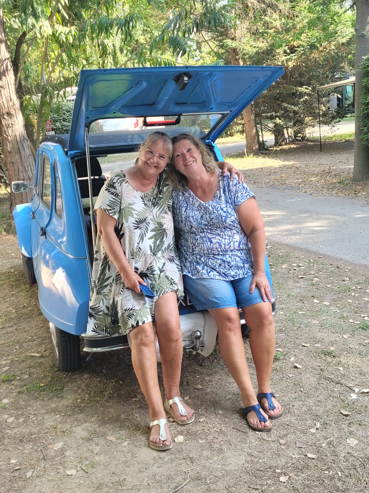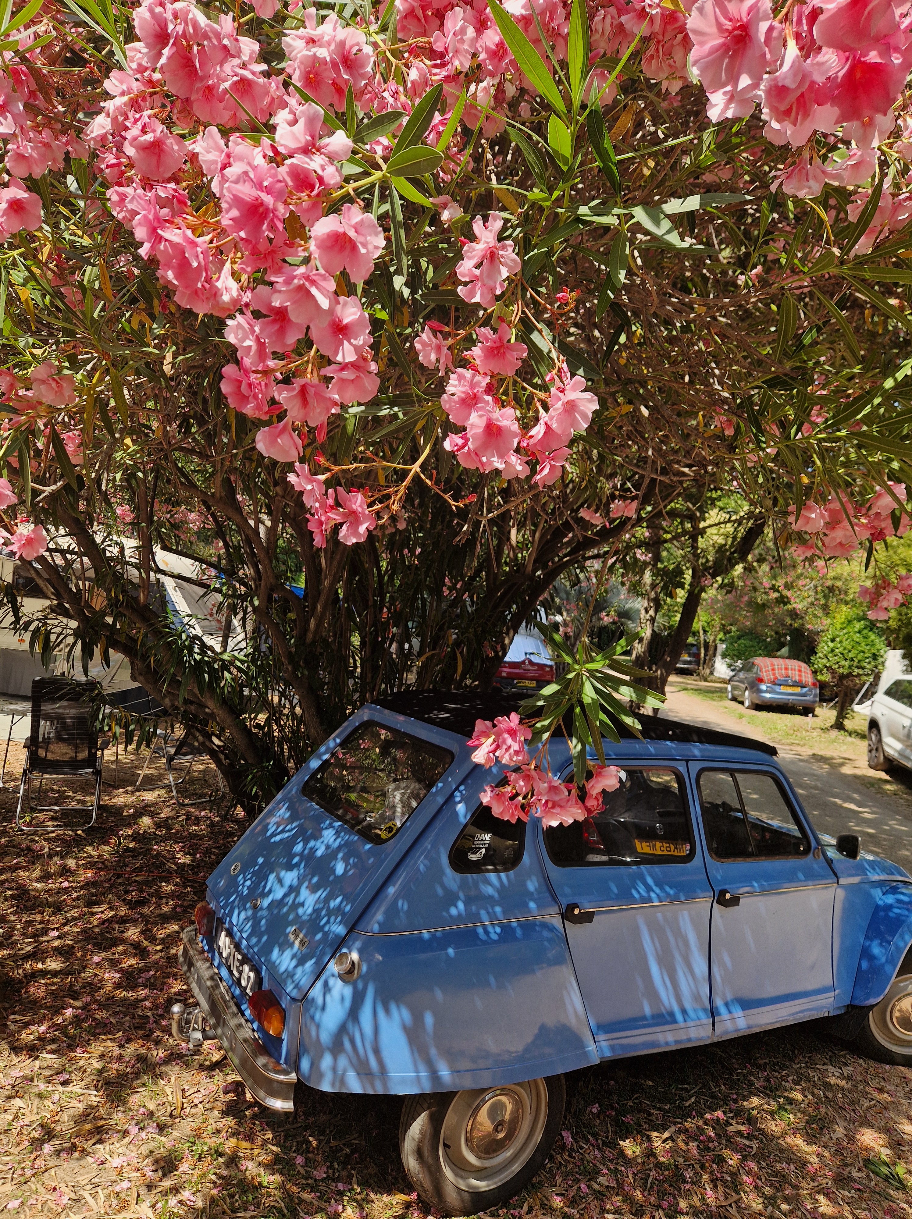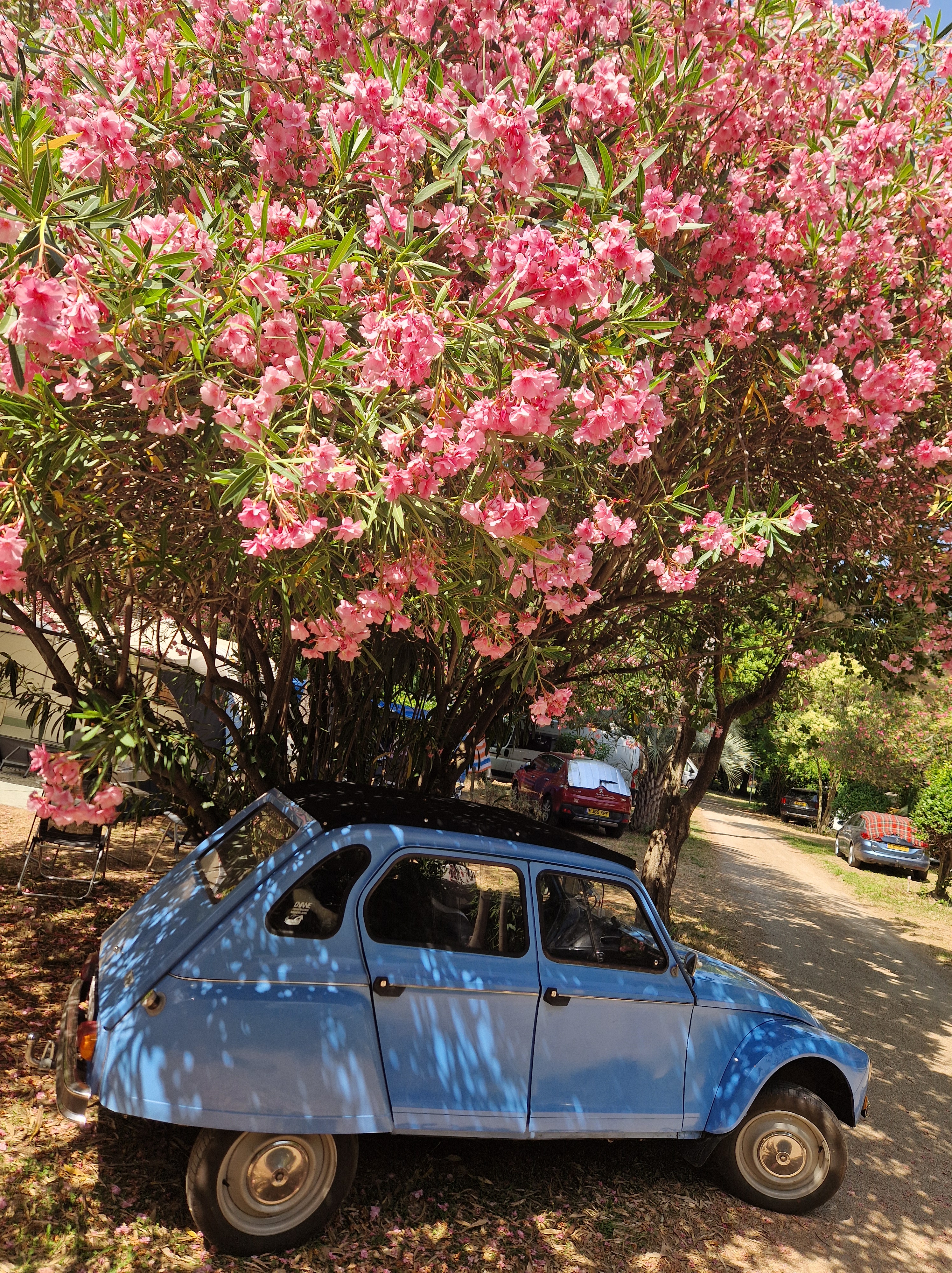 Mijn collega Els van de redactie van het 2CV Clubblad is inmiddels gearriveerd. We doen een fotoshoot van ons tweeën in de kofferbak en zetten de Dyane onder een grote oleander voor de coverfoto. De rest van de dag lummelen we rond de tent. Beetje scharrelen, beetje pakken. Voor de fan zitten en lezen.