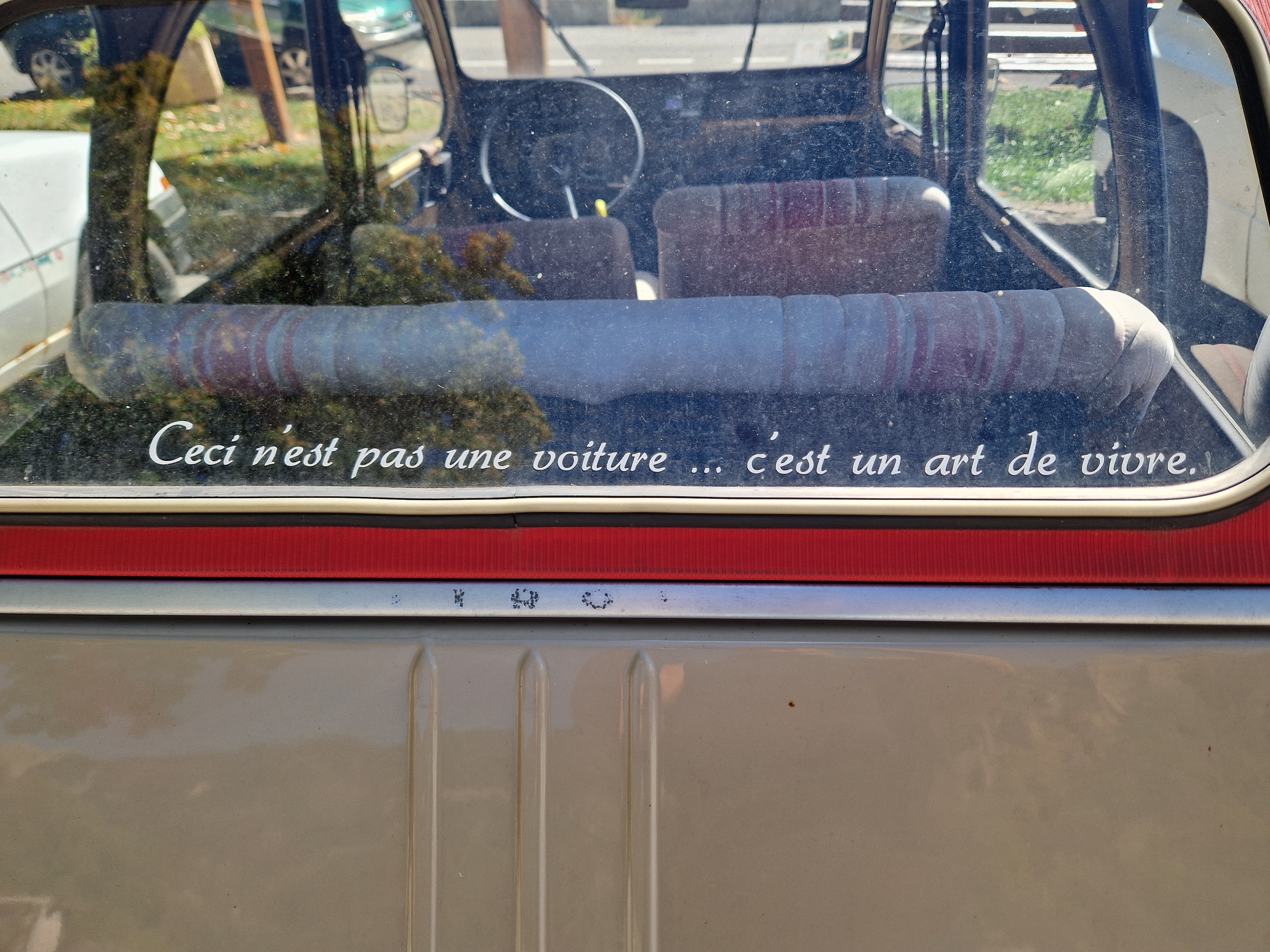 Hij is van 24 februari (Ma’s verjaardag!) 1984 en in 2021 is hij naar Nederland gekomen. De kleur Bleu Camarque, code AC 635, is alleen in 1984 gebruikt. Het vergrijsde blauwgroen doet denken aan de zinderende zomerlucht boven de Rivièra. De Nederlandse kentekenplaat achterop begint met N-7. Charles Trenet zong erover, de route nationale N7: “Le ciel d’été remplit nos cœurs d’sa lucidité […] on est heureux Nationale 7” [“De zomerhemel vult onze harten met zijn helderheid, […] we zijn gelukkig op de N7.”] I rest my case. Eén en al vrijheid.