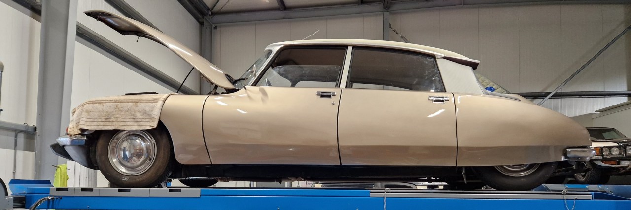 Tsja, en dan staat er zo’n ‘snoek’ op je oprit dan moet er ook mee gereden worden. Dat is een heel andere ervaring dan rijden met de ‘eend’. In eerste instantie zijn we vooral aan het vergelijken: de Dyane was gelijk vertrouwd, ons troetelbeessie, ons ezeltje. De DS is nog niet zo eigen, zij is …